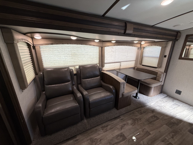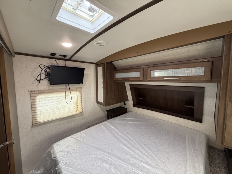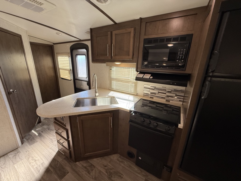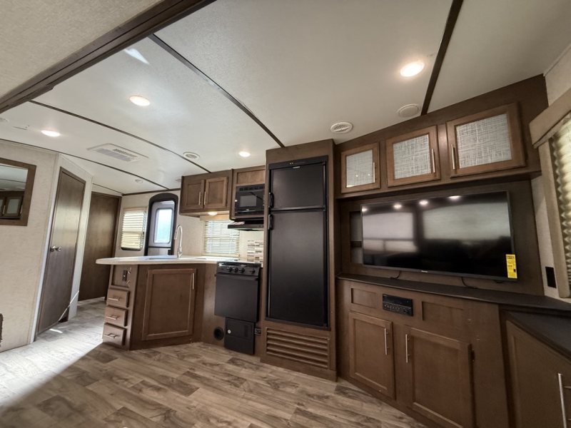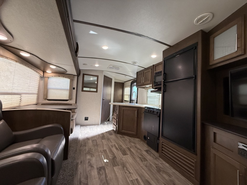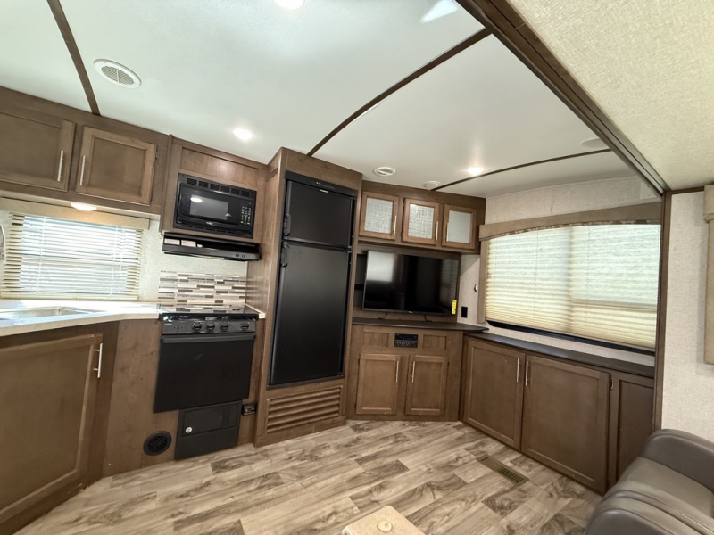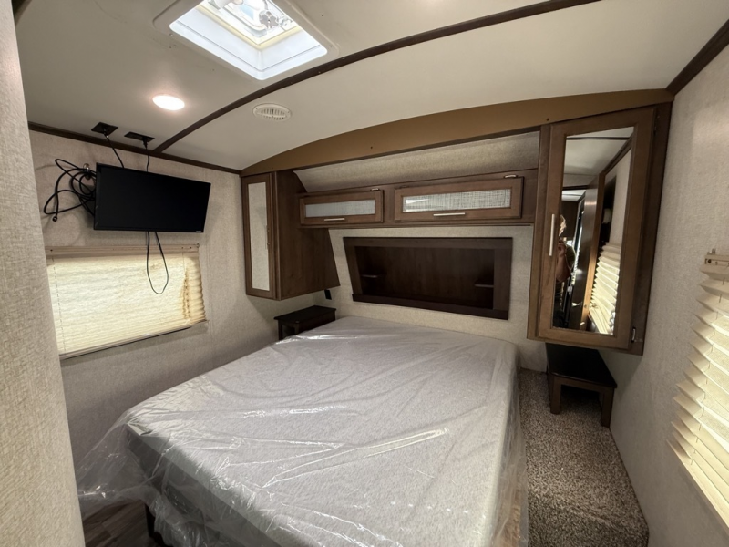 2018 KEYSTONE COUGAR 27RES IS A BEAUTIFUL ALL FIBERGLASS TRAILER WITH 4 SEASON WINTER PKG, ISLAND KITCHEN GREAT BIG LIVING ROOM. PRIVATE KING BEDROOM IN FRONT. LARGE SLIDE OUT. COLD A/C, PRIVATE FRONT KING BEDROOM WITH CLOSETS AND SOLID DOORS. COMFORTABLY! GREAT LAYOUT FOR FAMILIES OR FULL-TIME LIVING.