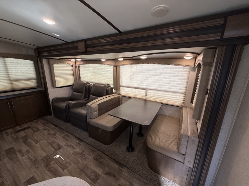 SPACIOUS LIVING AREA WITH RECLINERS & DINETTE SLEEPER. ENTERTAINMENT CENTER. OPEN KITCHEN WITH DOUBLE SINK, 3-BURNER STOVE, OVEN, MICROWAVE & DOUBLE DOOR FRIDGE.