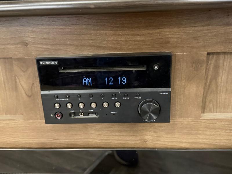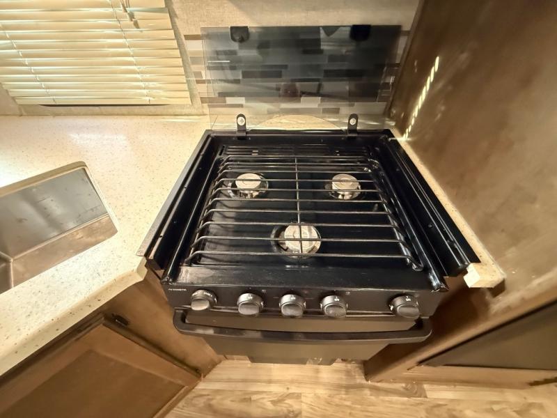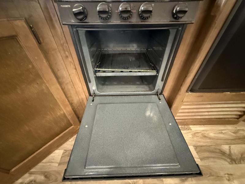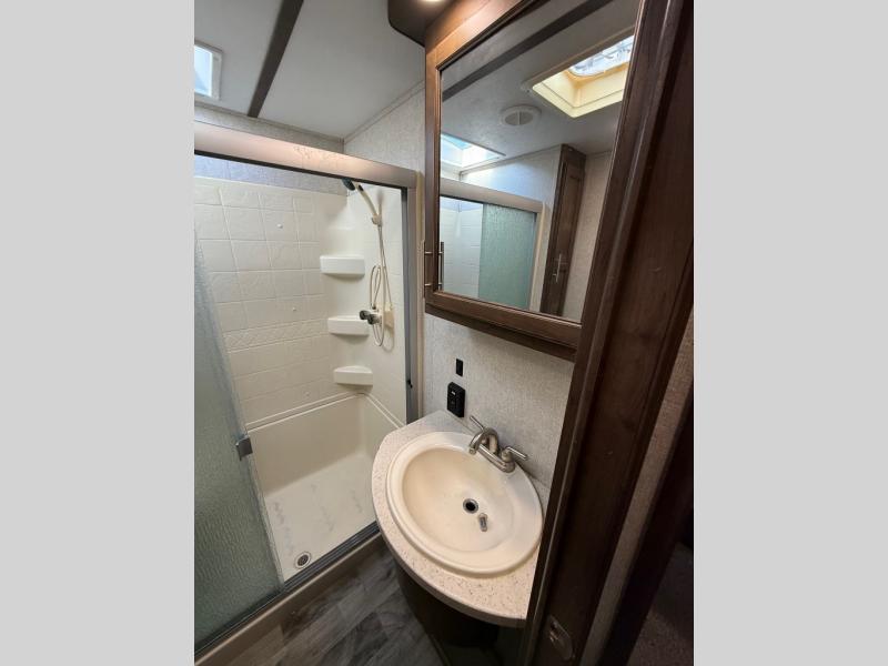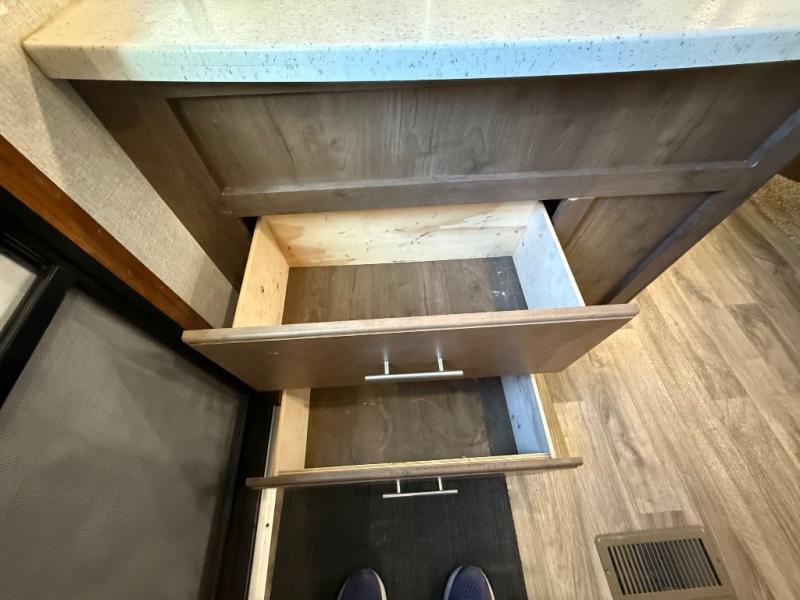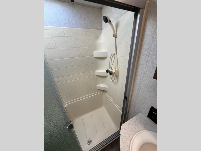 As you enter this model, you will be in the combined kitchen and living area. To your left there is a l-shaped counter with a double sink, three burner range, refrigerator, and overhead cabinets. Next to the refrigerator, on an angle you will find an entertainment center to enjoy. Along the rear wall there is a storage cabinet for your movies, games, and such. The slide out along the road side features a tri-fold sleeper sofa with overhead cabinets, and a booth dinette. You can choose theater seating in place of the sofa, and/or a free standing dinette with chairs instead of the booth dinette.