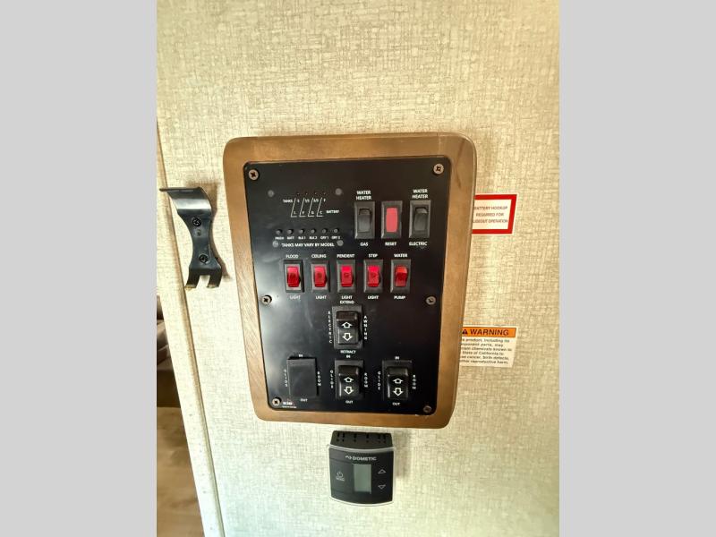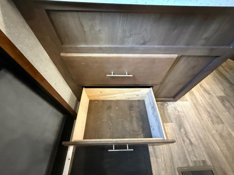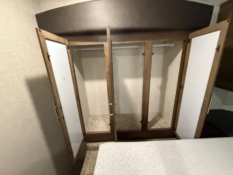 The front bedroom features a queen bed with a nightstand, and wardrobe. There is a slide out in the room which has a wardrobe for more storage. Across from the bed you will find a TV and hamper.