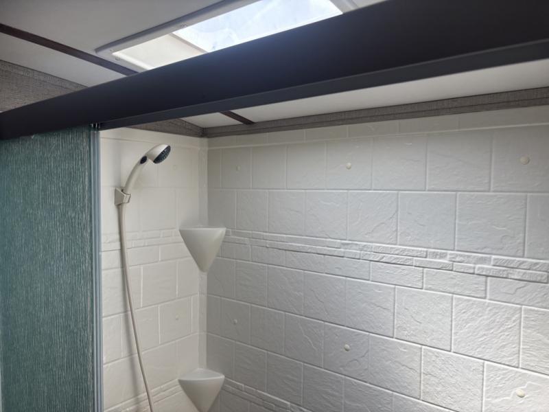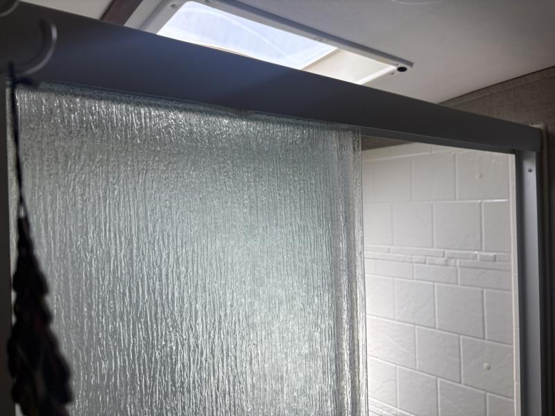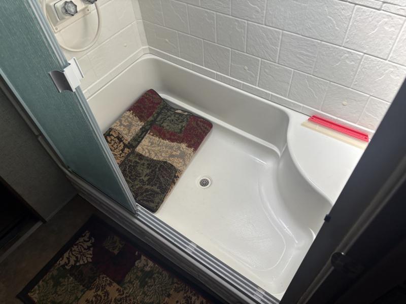 A walk-through bath leads to the front master bedroom. As you enter the bath area there is a shower with seat on the right, and a toilet plus vanity and sink can be found on the left side.
