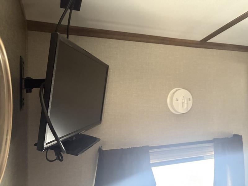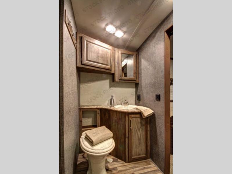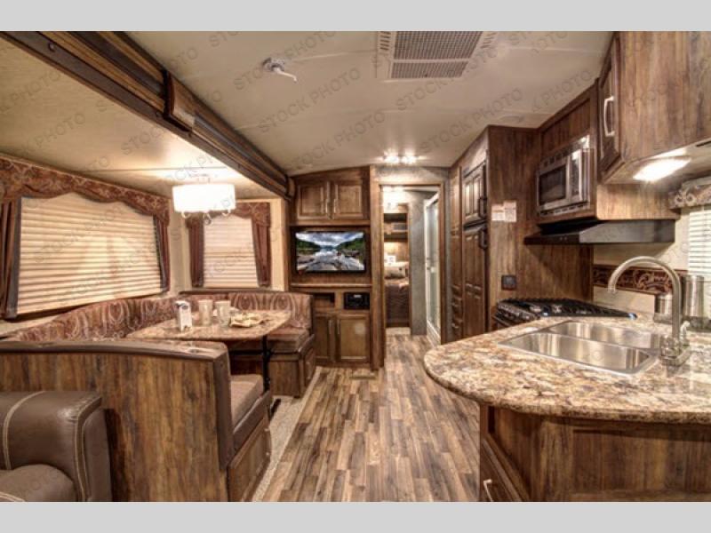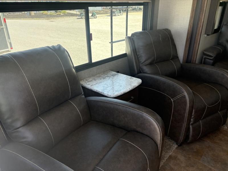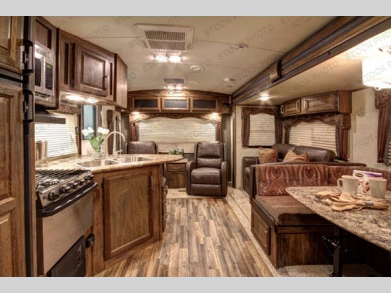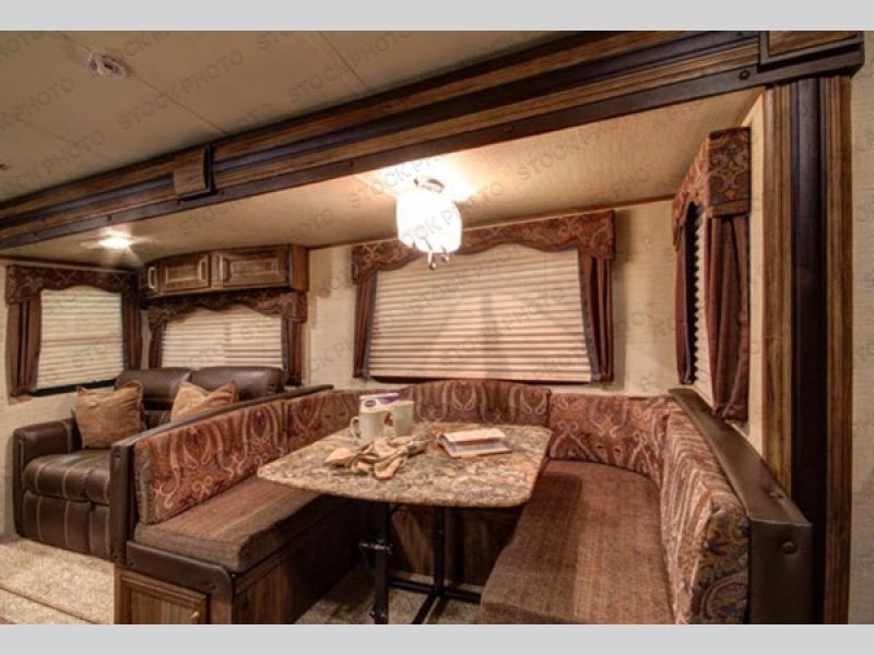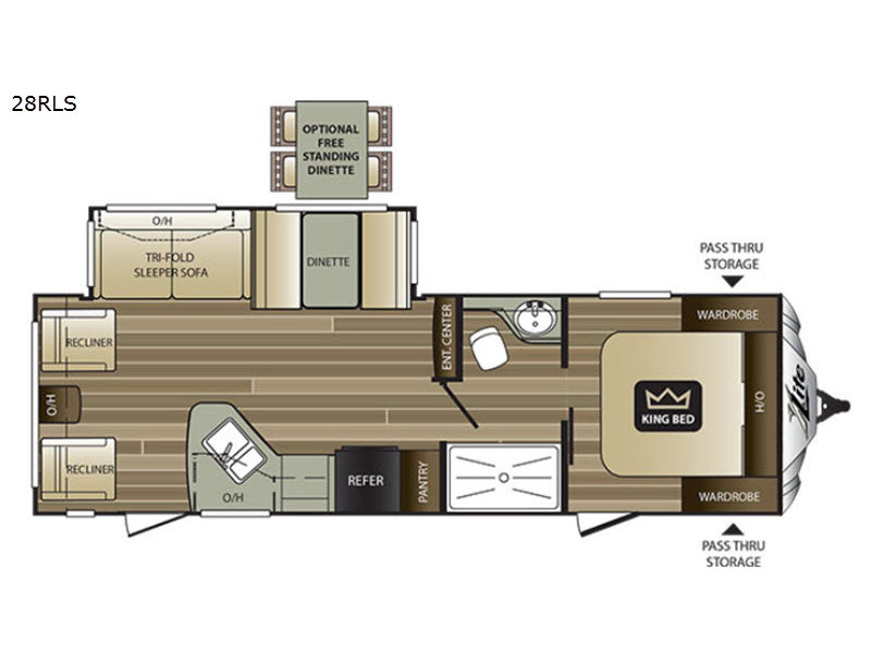 As you enter the main entry you see two recliners with an end table and overhead storage space along the rear wall. There is a road side tri-fold sleeper sofa and booth dinette slide out for plenty of seating during mealtimes and just hanging out. Plus, both can be quickly converted to sleeping space for family or guests. An optional free-standing dinette can be chosen in place of the booth dinette. A nearby entertainment center can be easily viewed from anywhere in the room.