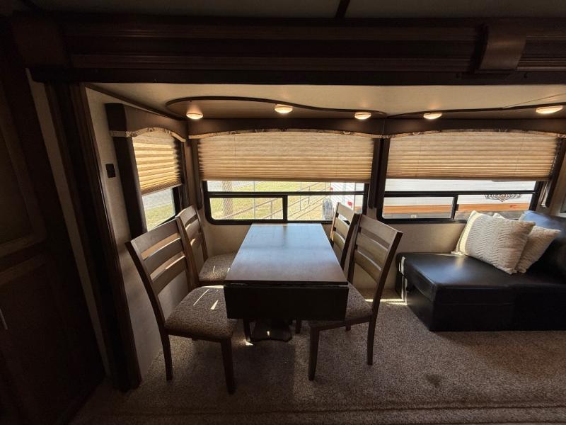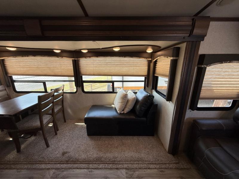 Step inside 33MLS to your left to find an entertainment center within a slide out. On the opposite side there is a slide featuring a free-standing dinette, and theater seating with overhead cabinets, or you can choose an optional booth dinette and recliners. Next to the slide there is a tri-fold sleeper sofa with additional storage above.