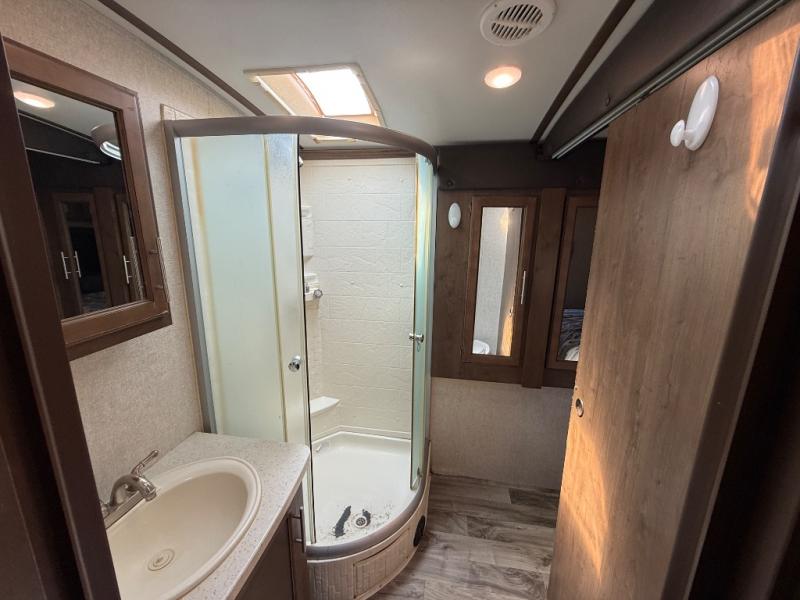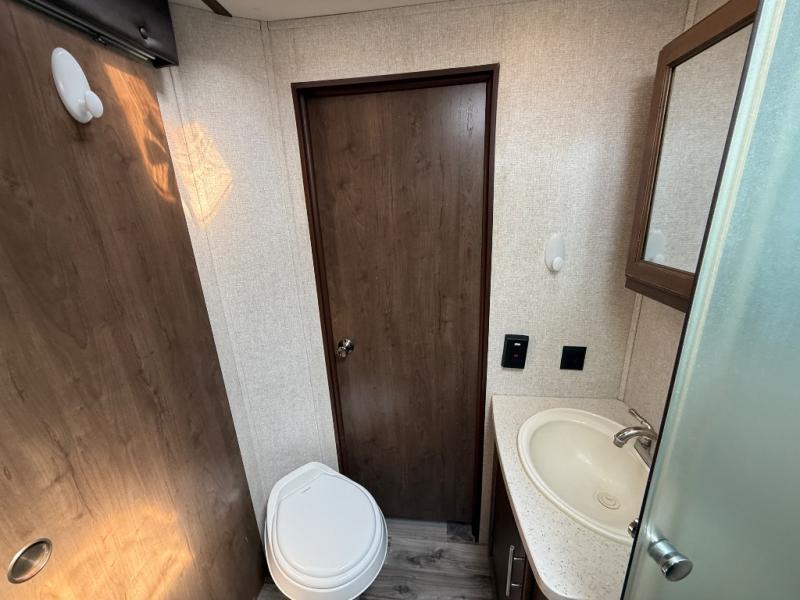 If you are looking for the restroom then head towards the front of the trailer. The side isle bath includes a neo-angled shower, sink, toilet, and linen cabinet, plus a second entry into the bath from the bedroom.