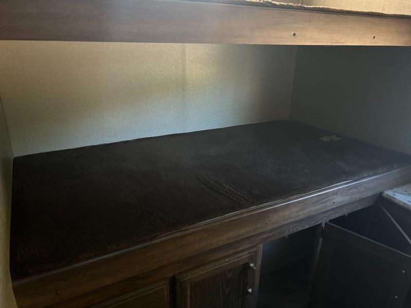 In the rear of the trailer is a private bunkhouse including a jack knife sofa below a flip up bunk slide out along the road side. On the opposite side there is a set of bunks with storage underneath. These bunks have different measurements. An entertainment center is between the set of bunks allowing everyone viewing space while they hang out in this room.
