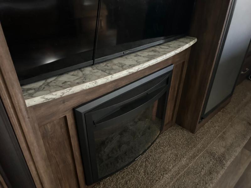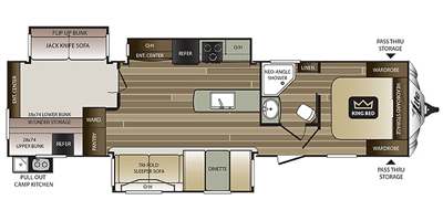 The outside kitchen includes a refrigerator, plus a pull-out camp kitchen including a single sink and two burner cooktop. You will also enjoy the front pass-through storage for all of your outdoor camping gear, and so much more!