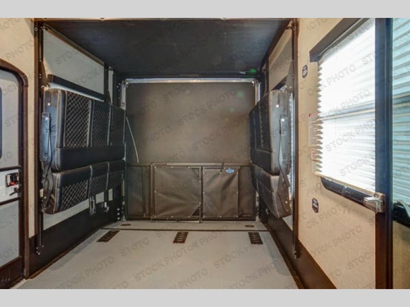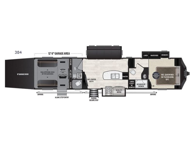 Enjoy each off-road trip when you are traveling in this Fuzion 384 toy hauler fifth wheel by Keystone RV. This unit offers a 12' 6" garage space for your toys, and a luxurious living area for you and your friends to hang out when you aren't playing outside. Once your toys are unloaded turn the garage into a living area or a place for your kids to enjoy. There is a loft, dual opposing sofas, and an electric queen bed for relaxing, playing games, or sleeping at night. The 40" TV can be used for entertainment throughout your trip or maybe just for a special movie night.