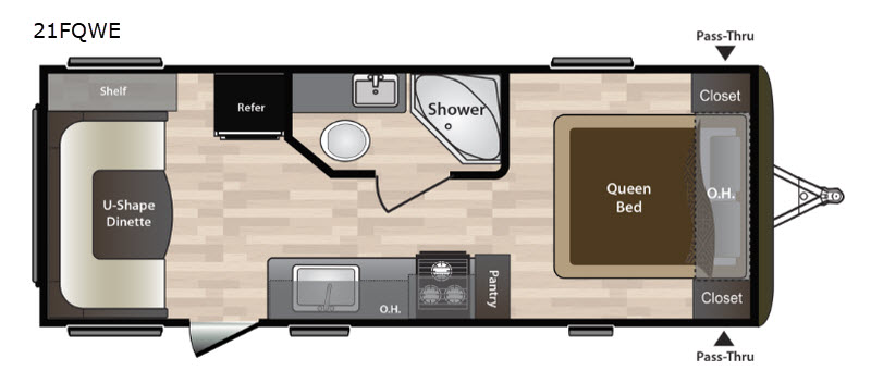 Take your family away in this Hideout 21FQWE travel trailer by Keystone RV. Along the rear there is a u-shaped dinette where you can enjoy your meals plus at night this area doubles as additional sleeping space. Mom and dad will enjoy getting a good night's rest on the front queen bed. In the spacious bathroom you will find everything you need to adequately get ready for the day. Outside along the front there is a pass through storage area for any extra camping gear.