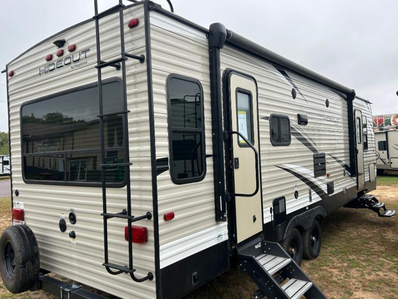 With features such as two entry doors, a spacious kitchen, a rear living area, and a single slide out it is easy to see why this Hideout 26RLS is one of Keystones most popular travel trailers. Come enjoy your meals at the u-dinette and then plan to relax on the optional tri-fold sofa sleeper or at the lounge chairs along the rear wall. At night you can retreat to the private front bedroom where you will find a queen bed. Outside there is a pass-through storage area for your outdoor camping gear and in the evening you may want to visit with your family and friends while sitting under the awning.