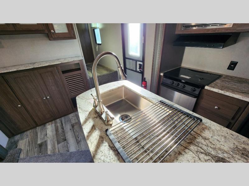 You are going to love the spaciousness of this Keystone Hideout fifth wheel model 299RLDS. With dual slide outs in the rear living area you will easily see the conveniences when you step inside. After you set up camp then come relax at the theater seats and watch a little TV at the 50" HDTV. Meal prep is a breeze at the island with the extra counter space and the large sink. Outside you will find a refrigerator where you can store drinks or snacks!