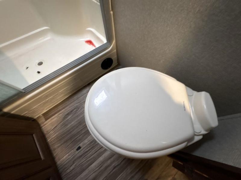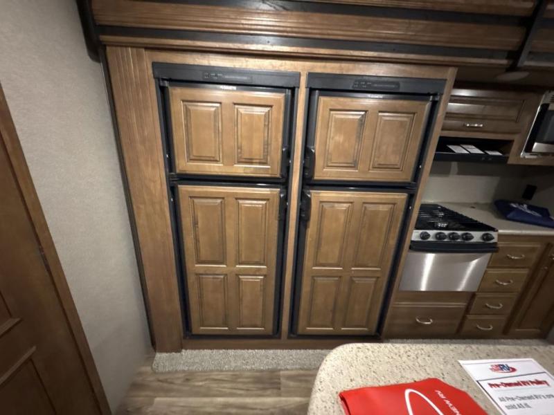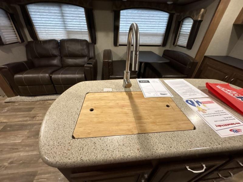 Before you enter model 332BH, check out the outdoor entertainment center with a fridge. You can finally watch a movie under the stars! Inside you have a front bedroom with a queen bed and dual wardrobes which will hold all of your clothing items during your vacation. The rear of this unit has a bunkhouse with a bunk above two wardrobes and an entertainment center. The other bunk is above a cube sofa which can also be used for sleeping at night. You will enjoy the kitchen island for preparing food and cleaning up after you are finished. The dinette is the perfect place for eating your meals with loved ones.