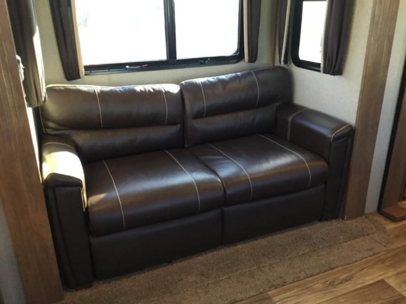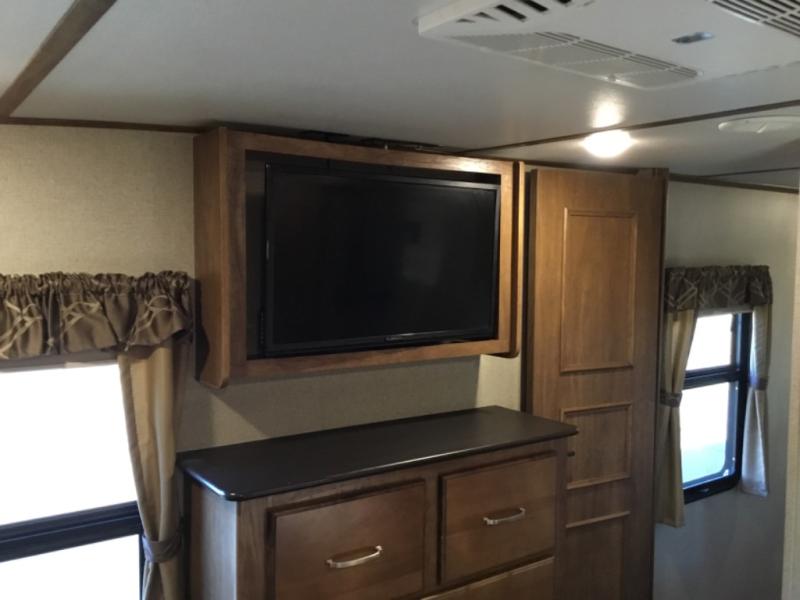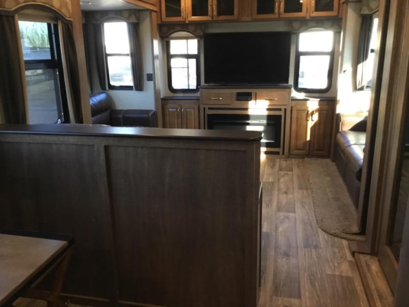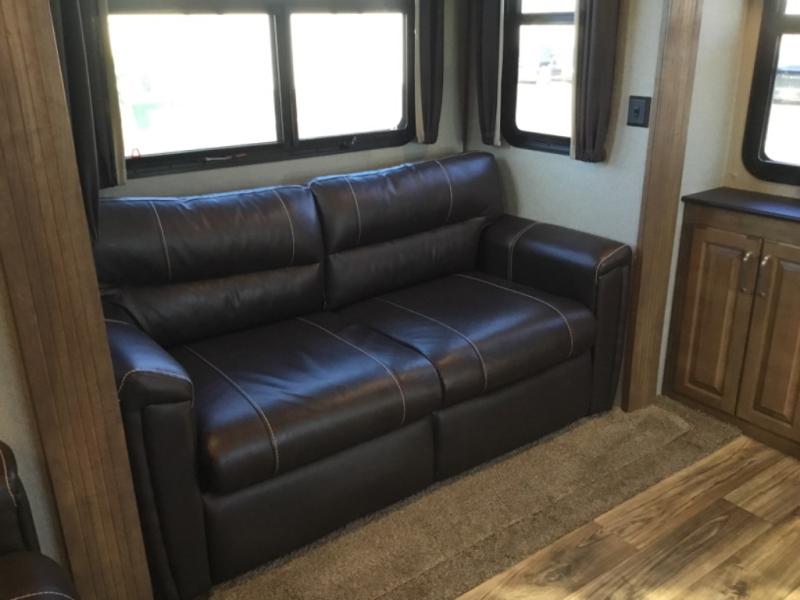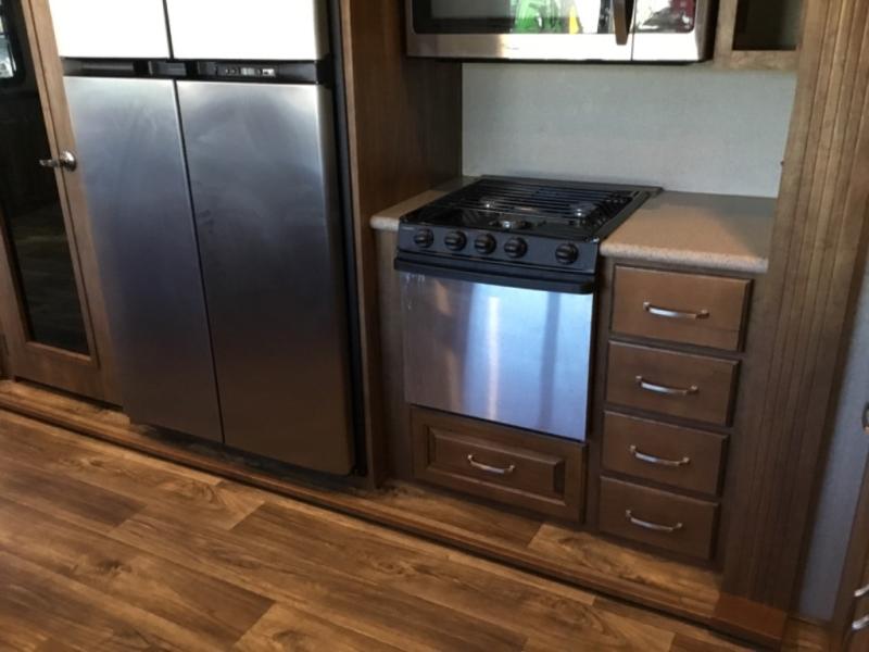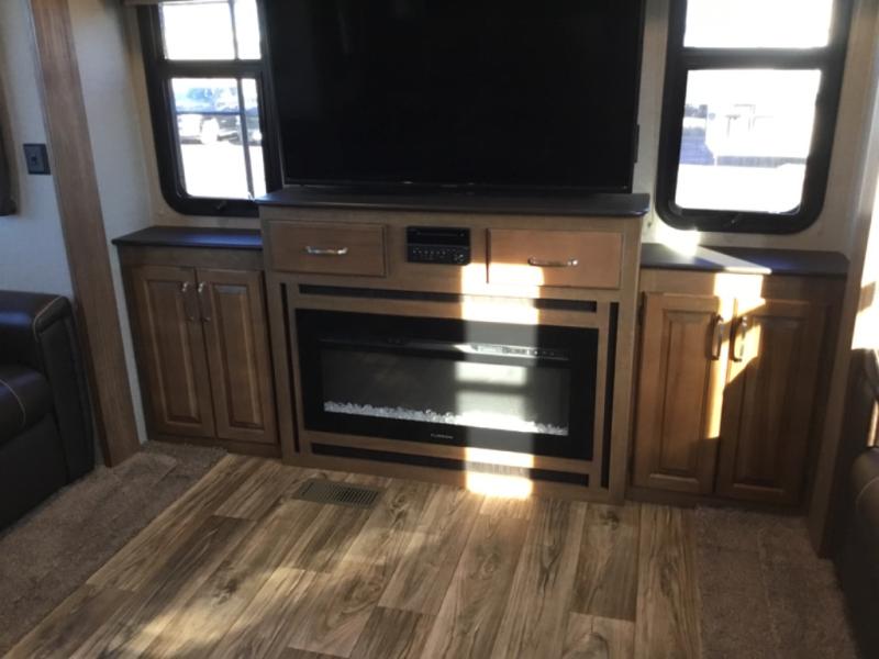 This rear entertainment layout Laredo fifth wheel by Keystone RV makes it easy to enjoy week long get-a-ways. This unit features four slide outs, sleeping for six, a king bed in the master, plus an 18 cu. ft. refrigerator in a spacious kitchen to enjoy! The living space is a great place to entertain or gather with family and friends. There are dual opposing slide out tri-fold sleeper sofas, and theater seating for two along the interior half wall. The outer rear wall features a full wall entertainment center with storage overhead and along each side, plus an optional fireplace can be added if you like, and so much more!