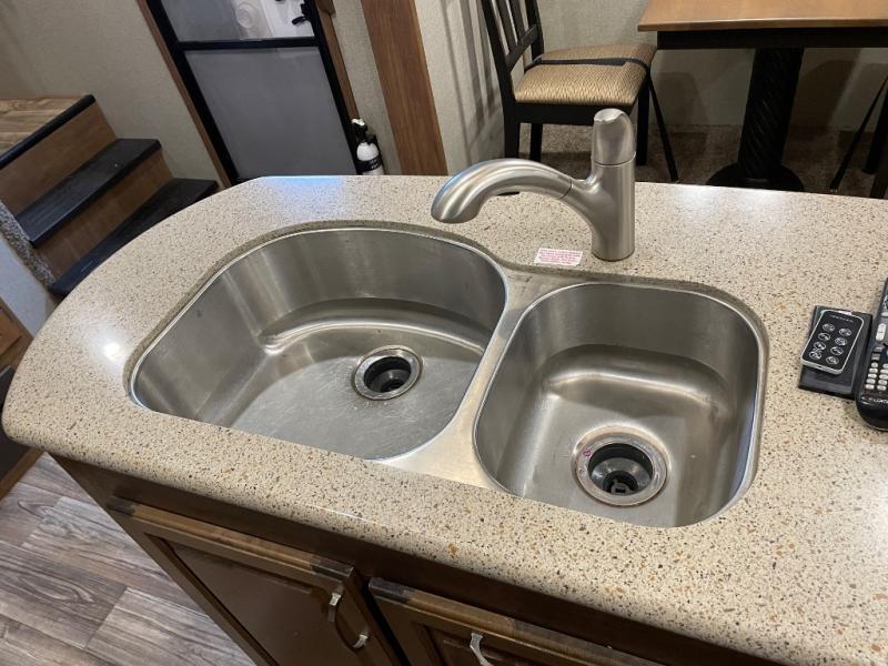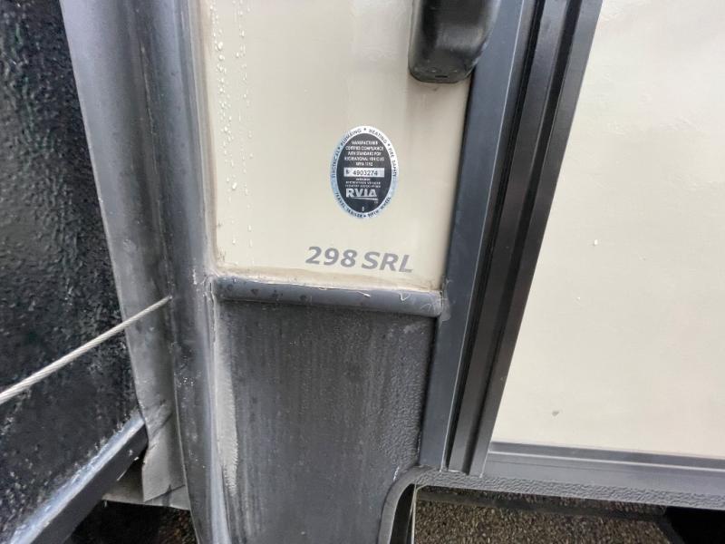 Model 298SRL, has a free-standing dinette and a 39" TV with fireplace beneath within one of the large slide outs. Just outside this area, you can enjoy the outdoor kitchen, which includes a refrigerator, a TV, an outside stereo, and overhead cabinets. This is a feature any outdoor chef in the family would certainly enjoy! Back inside will find a tri-fold sofa sleeper with end tables and overhead cabinets. You can easily create added sleeping space when needed at night. You will also love all of the outside storage near the front with a pass-through compartment making it easy to stow away all of your outdoor camping gear, and more!
