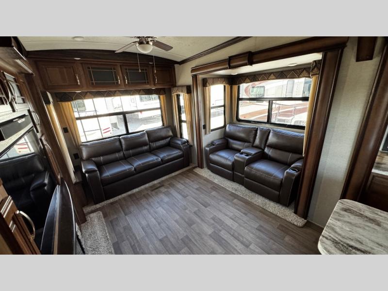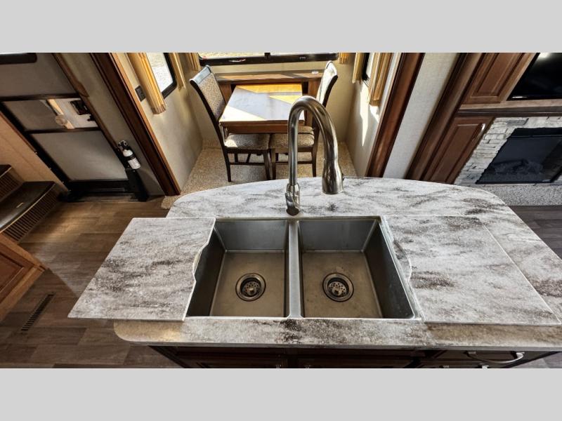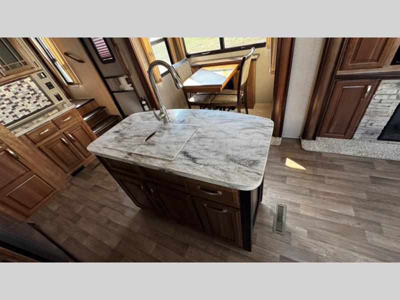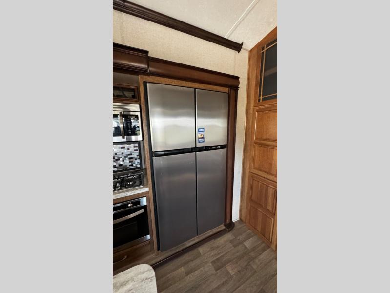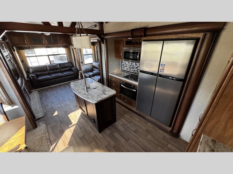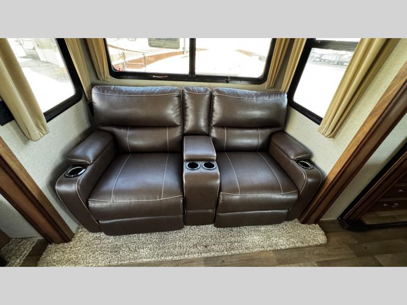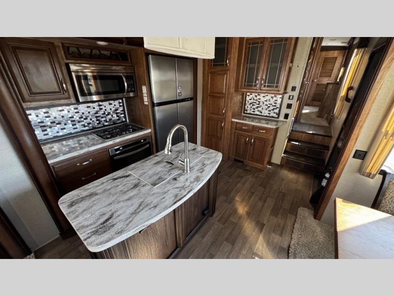 Opposite find a slide out with theater seating, and another slide out with a refrigerator, convection microwave oven, and three burner range. There is also counter space and additional storage. A nice pantry is adjacent along the interior wall straight in from the door which includes additional cabinet space both above and below. A convenient island is available in the center of the room and features double sinks for easy cleanup. Don't forget about the hide-a-bed sofa with end tables and overhead cabinets along the rear wall of the fifth wheel.