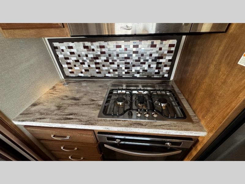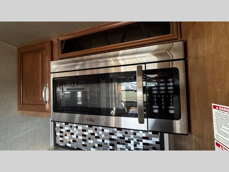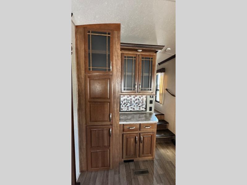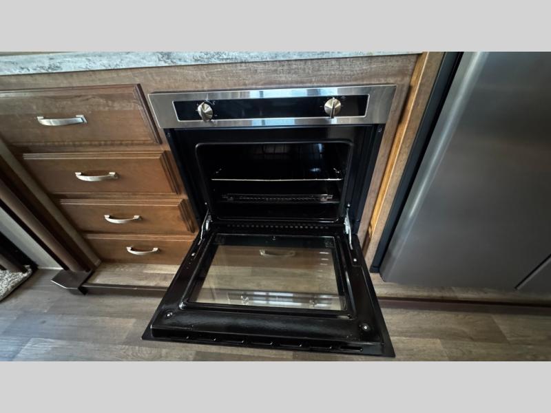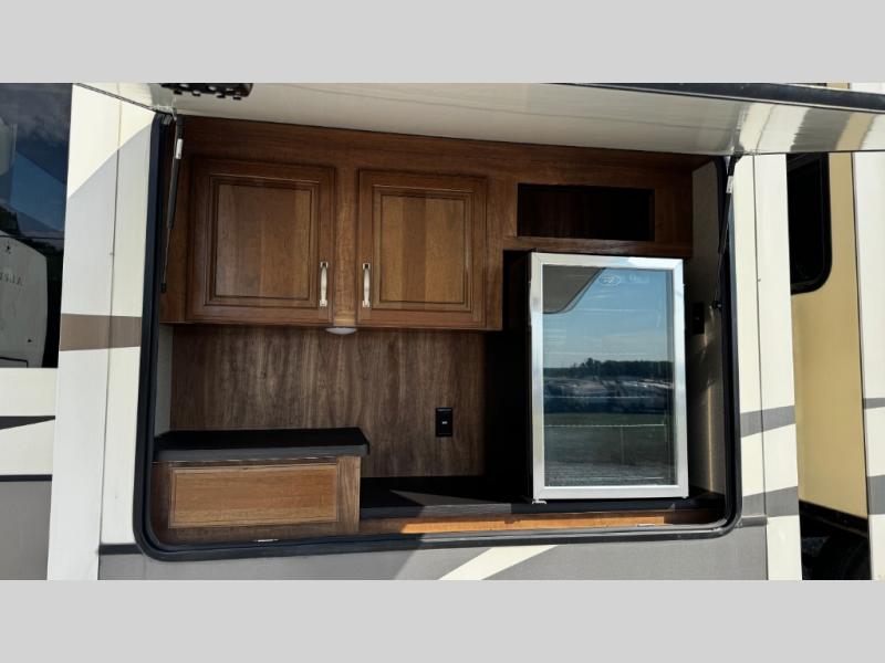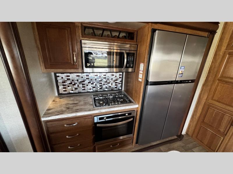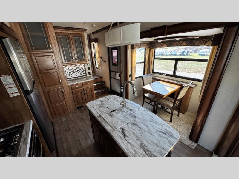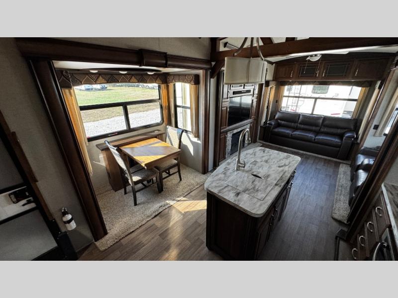 Opposite find a slide out with theater seating, and another slide out with a refrigerator, convection microwave oven, and three burner range. There is also counter space and additional storage. A nice pantry is adjacent along the interior wall straight in from the door which includes additional cabinet space both above and below. A convenient island is available in the center of the room and features double sinks for easy cleanup. Don't forget about the hide-a-bed sofa with end tables and overhead cabinets along the rear wall of the fifth wheel.