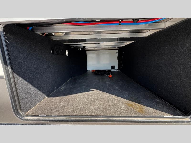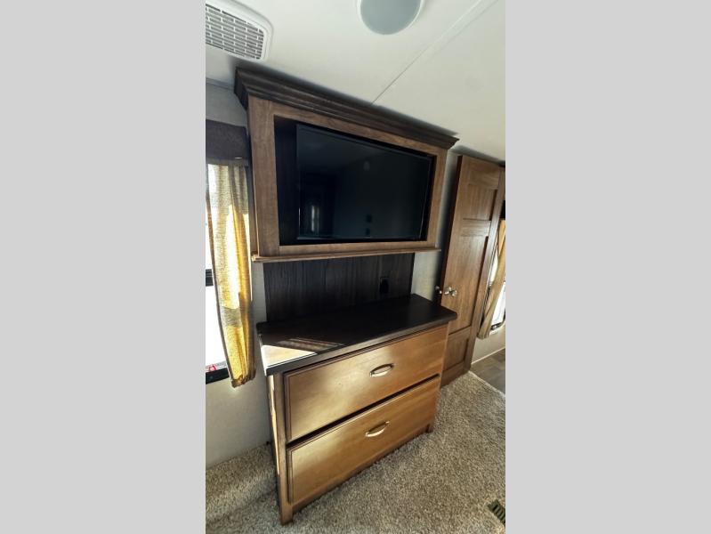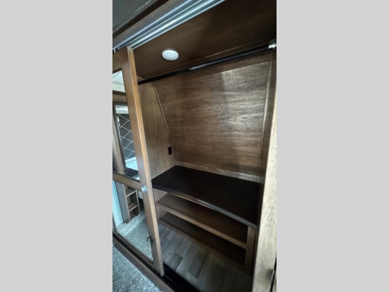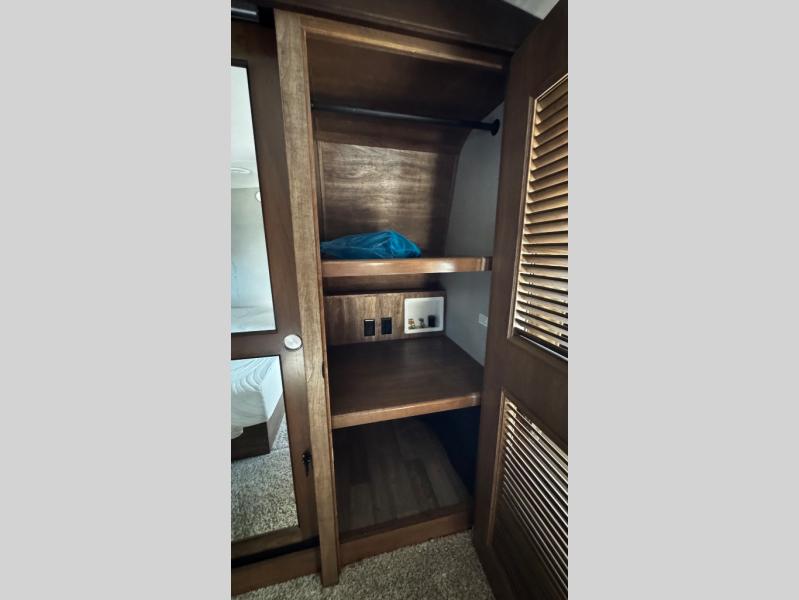 Through the door at the head of the hall leads into a spacious master bedroom in front. Here you can relax and unwind from a full day of adventure. Sleep comfortably on a queen or optional king bed slide out with storage underneath. There is a dresser opposite with overhead HDTV. The front features a closet, plus an area that has been prepped for a stackable washer/dryer.