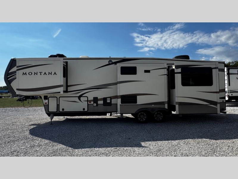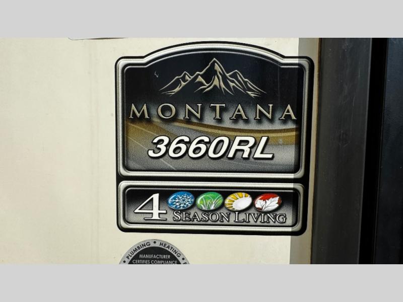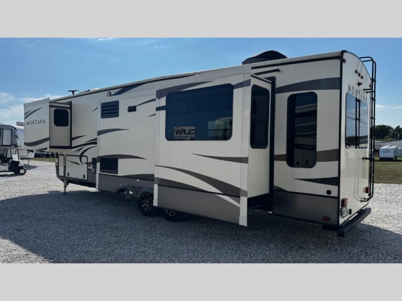 This Keystone Montana fifth wheel 3660RL offers plenty of space with FIVE slide outs, a rear living area, kitchen island, exterior entertainment center, plus much more!