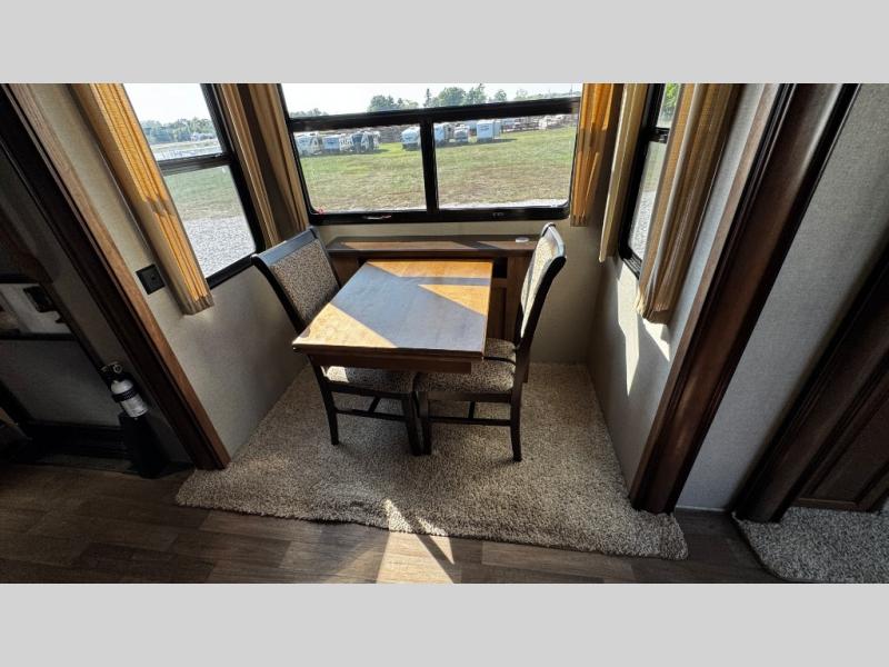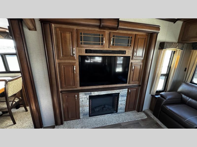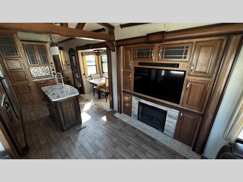 Step inside and be greeted by a wide open interior with a combined kitchen and living area. There is a slide out dining table for four, and a second slide out with an entertainment center, HDTV and fireplace to the left of the door.