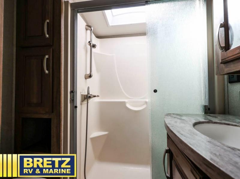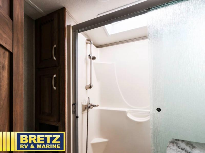 Through the door at the head of the hall leads into a spacious master bedroom in front. Here you can relax and unwind from a full day of adventure. Sleep comfortably on a queen or optional king bed slide out with storage underneath. There is a dresser opposite with overhead HDTV. The front features a closet, and space that has been prepped for a stackable washer/dryer.
