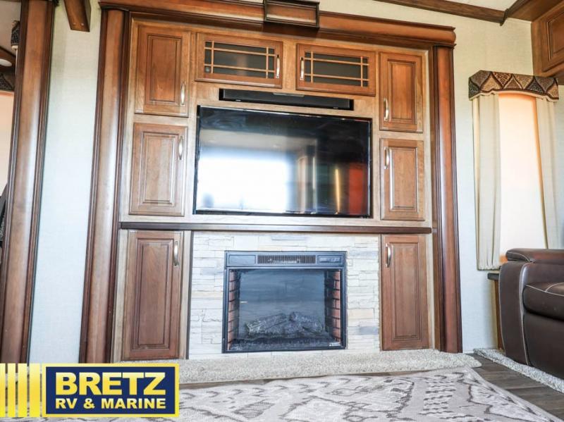 Step inside and you will be greeted by a wide open interior with a combined kitchen and living area. There is a slide out dining table, and a second slide out with an entertainment center, HDTV and fireplace to the left of the door.
