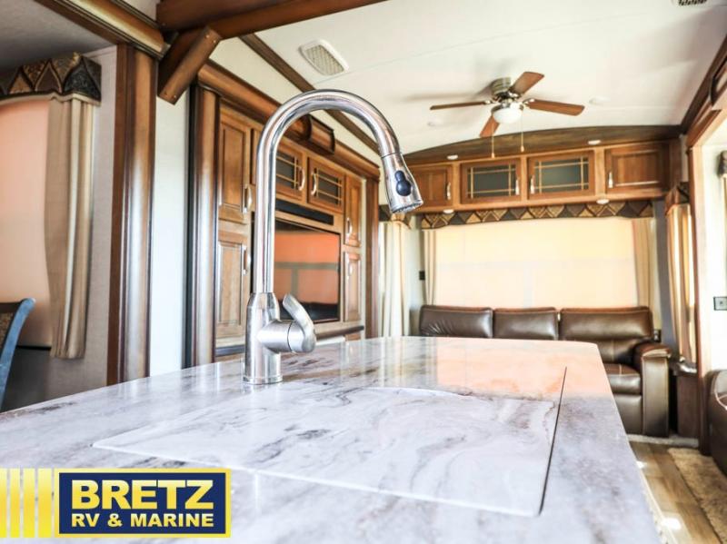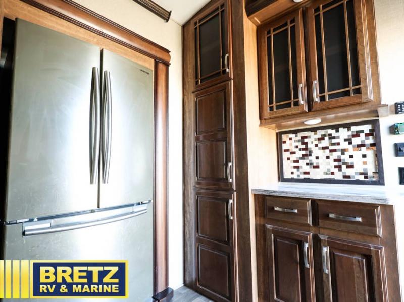 Opposite find a slide out with theater seating, and another slide out with a residential refrigerator, convection microwave oven, and three burner range. There is also counter space and additional storage. A nice pantry is adjacent along the interior wall straight in from the door which includes additional cabinet space both above and below. A convenient island is available in the center of the room and features double sinks for easy cleanup. Don't forget about the hide-a-bed sofa with end tables and overhead cabinets along the rear wall of the fifth wheel.