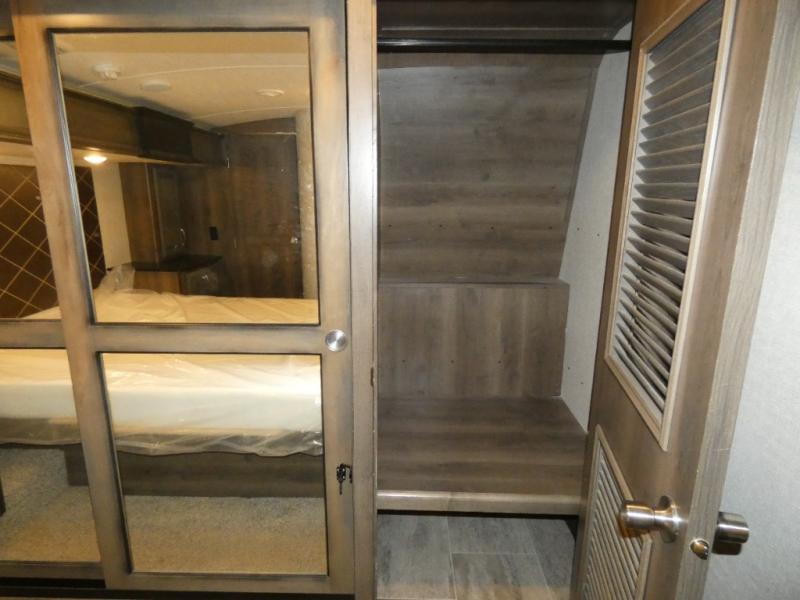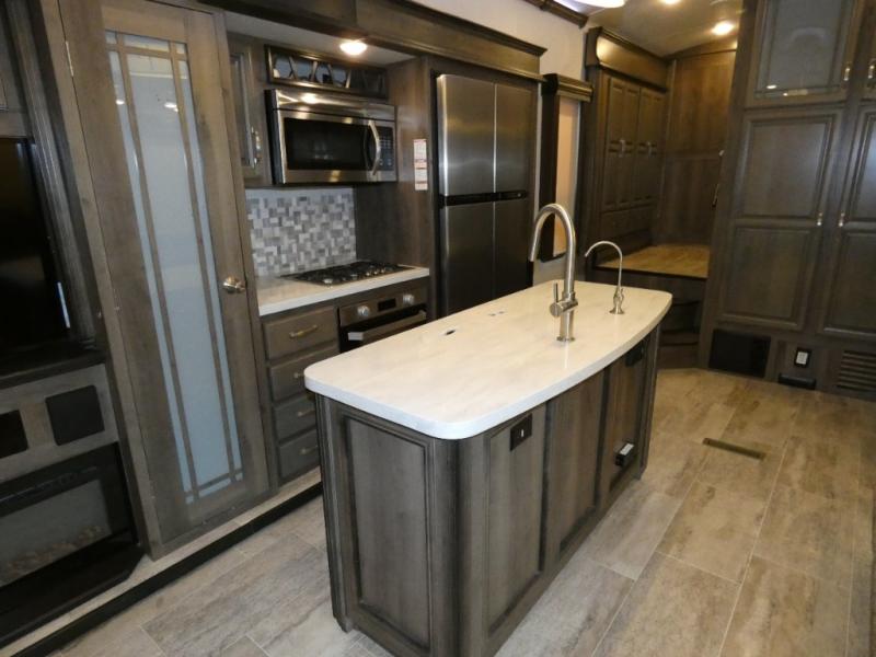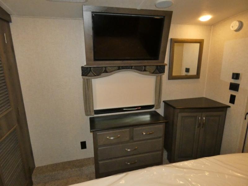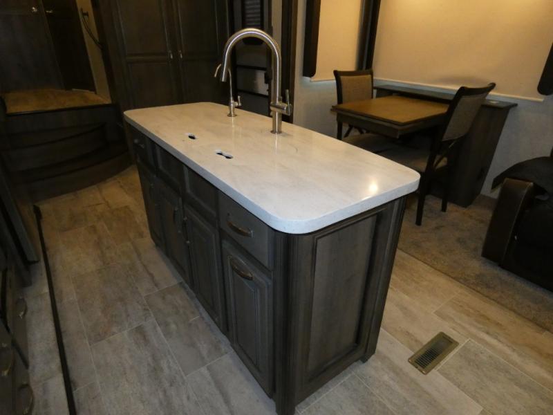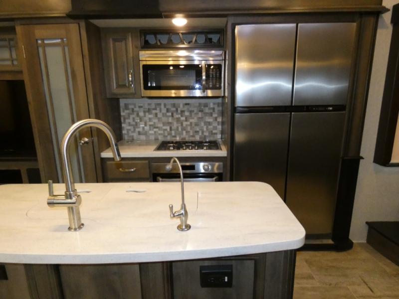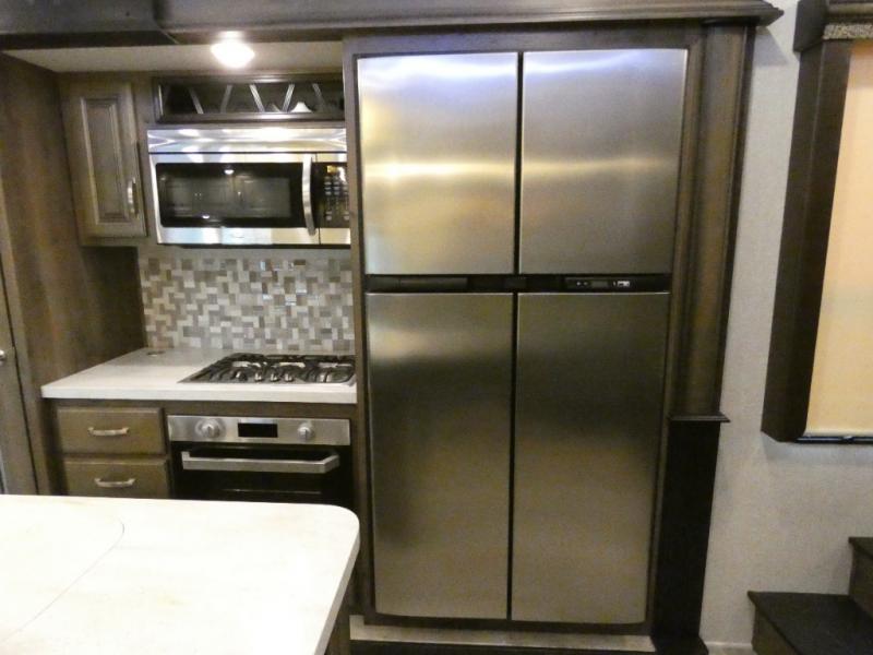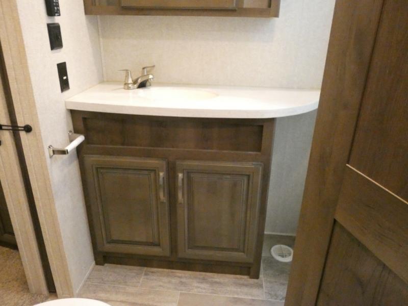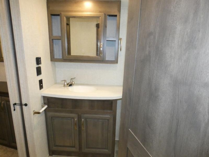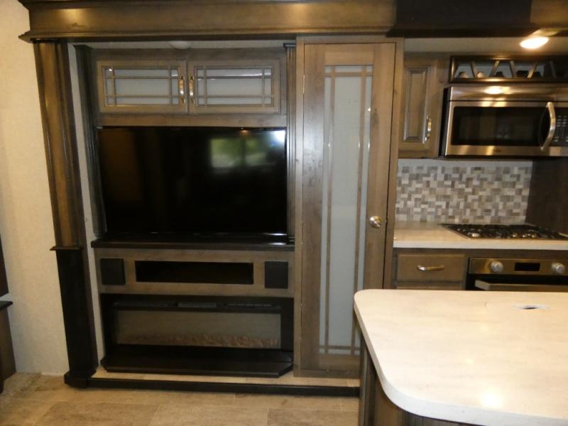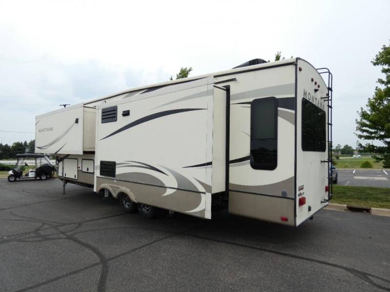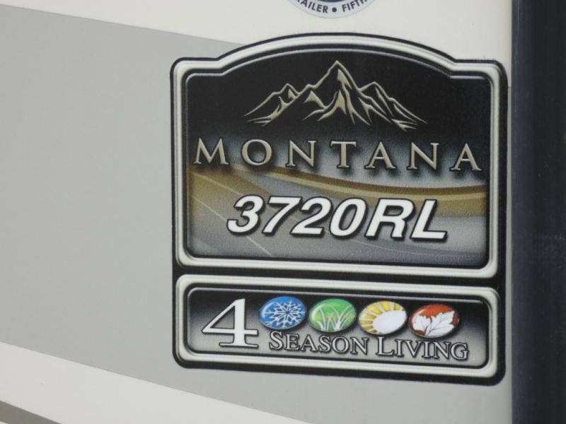 It's time to start planning your next campout vacation with family and friends in this Montana fifth wheel. Model 3720RL offers a wide open living and kitchen area thanks to the dual opposing slide outs. You are sure to enjoy the theatre seats with power recliners and additional furniture when watching the HDTV while keeping warm from the fireplace. The cook can prepare meals and the guests can wash the dishes on the kitchen island. There is an 18 cu. ft. RV refrigerator and convection microwave to mention a few other main features in the kitchen. You also have double entry into the bath as an added convenience. You will find plenty of storage throughout for all your things including an entry wardrobe. When enjoying the outdoors, you can watch the exterior entertainment center with 32" HDTV while sitting under one of the two awnings. Take a look around, this model is the one!