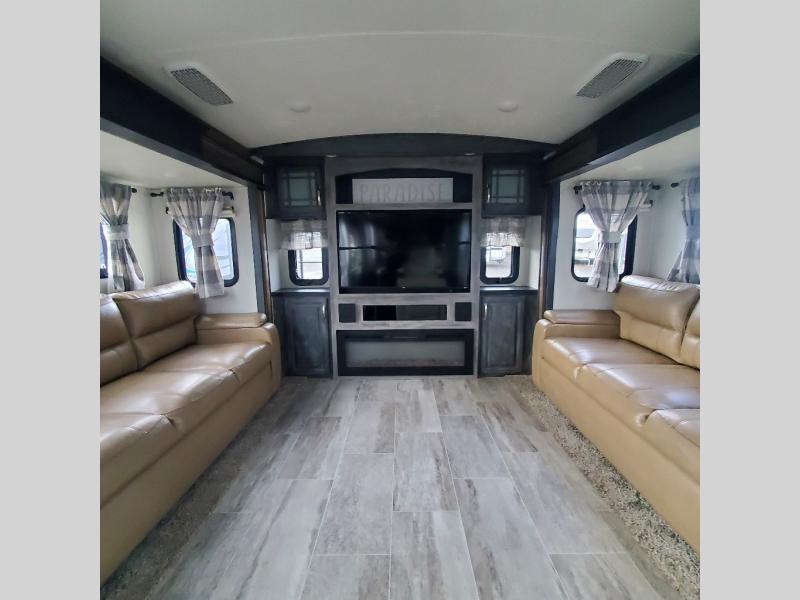 Enjoy the space provided by 5 slide outs in this Keystone Montana fifth wheel. With dual slide outs in the living area, and two slides in the kitchen area you will find the two rooms spacious and inviting. Model 3790RD offers a rear living and entertaining room with plenty of seating including dual hide-a-bed sofas and power theatre seats. Everyone can gather around the HDTV and fireplace to watch movies or the big game. The kitchen offers a separate space to make and eat meals. You will find a kitchen island, an 18 cu. ft. RV refrigerator, convection microwave, a hutch, and a pantry, plus more. You will find plenty of storage throughout as well as outside. Outdoors there is an entertainment center with 32" HDTV, and a slide out storage tray on the rear, plus much more!
