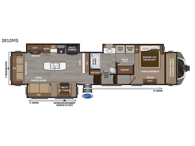 You are going to love the master suite in this Keystone Montana fifth wheel model 3810MS! With triple slide outs, a window lounge up front, and all of the necessities plus some, this can truly be your luxury home-away-from-home! The master suite features a unique front window lounge with storage underneath, a walk-in closet between the bedroom and bathroom including a washer/dryer prepped space, and access to the bathroom. The combined rear living and kitchen area allows you to make meals, visit with family, and relax while watching the HDTV all while being comfortable on the furniture with the warmth of the fireplace. The kitchen features a center island, an 18 cu. ft. RV refrigerator, convection microwave, a hutch, and a pantry, plus more. Outside you can watch the 32" HDTV and entertainment center, relax under one of the two awnings and enjoy the fact that you own a Montana.