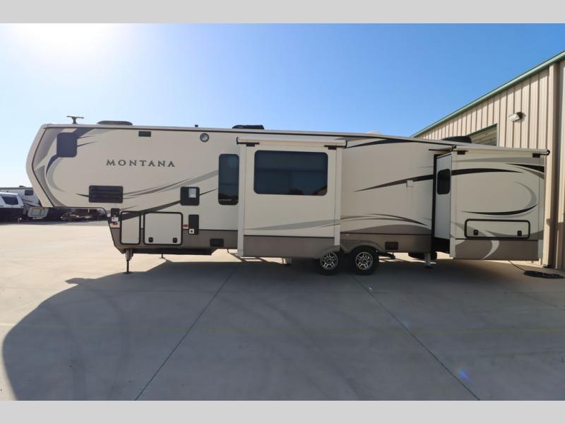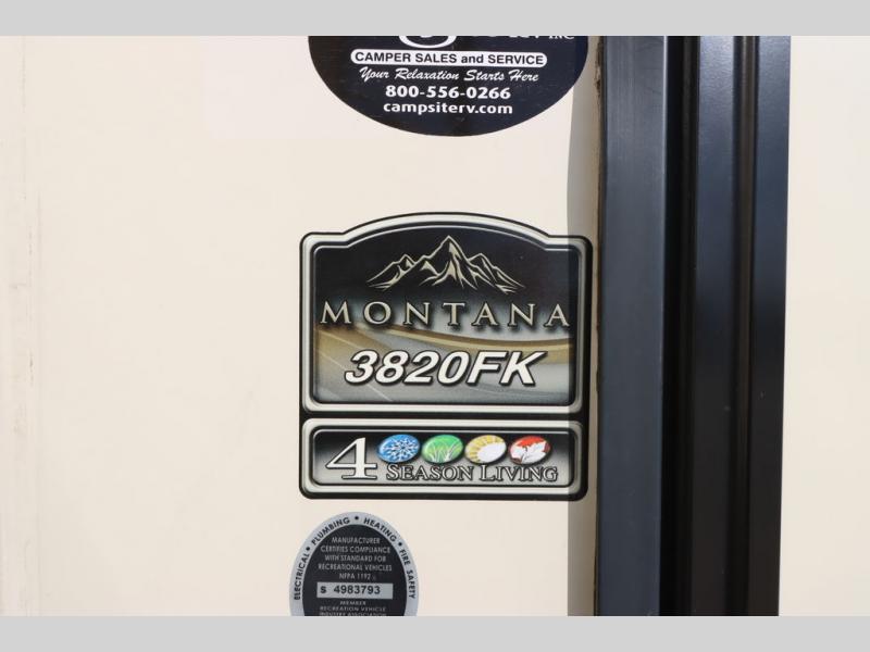 You are going to love everything about this Keystone Montana fifth wheel model 3820FK every time you take it out! With five slide outs, a u-shaped dinette up front, a buffet with cabinets, and all of the necessities plus some, this can truly be your luxury get-away-home! The separate kitchen also features a skylight, an 18 cu. ft. RV refrigerator, convection microwave, and patent-pending front window design above the u-shaped dinette with swivel table. The main entry brings you into the centrally located living room with plenty of seating, plus a HDTV and fireplace. The second entry into the fifth wheel is across from the bathroom and next to the rear bedroom. You will soon learn this Montana is the perfect fit for you and your family!