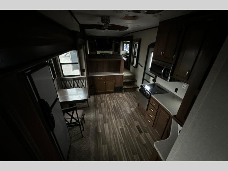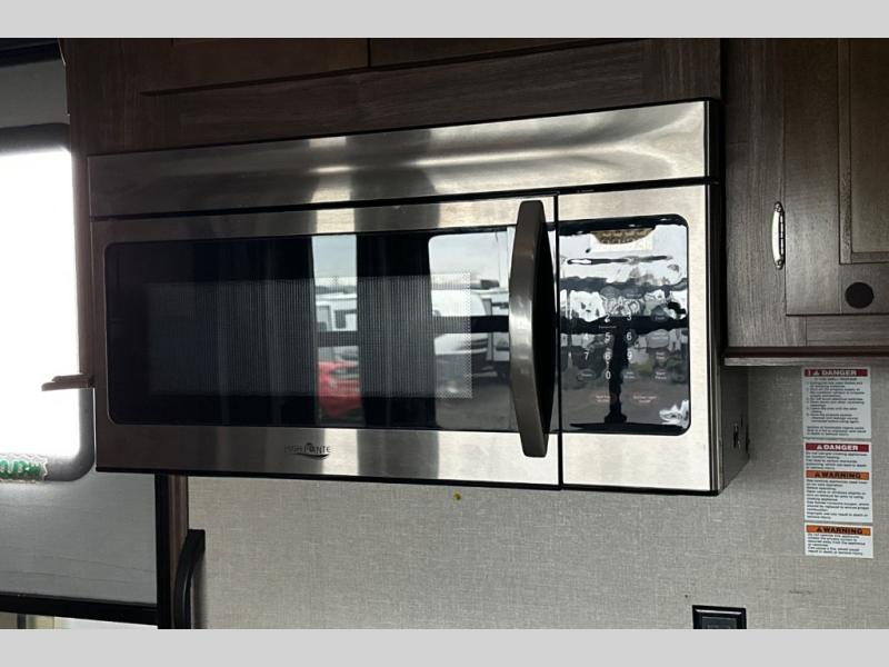 Have you been envisioning your four wheeler going with you to your favorite destination? Have you been searching for the perfect fifth wheel? This Montana High Country toy hauler fifth wheel might just be the perfect answer! Model 380TH allows you to camp comfortably, and has space to take along your favorite ride on toy! Below the rear bedroom you will find a unique garage with a motion sensor LED light and a ramp door for easy loading and unloading your toy. The front living area includes a telescoping HD LED TV above an electric fireplace with a remote, plenty of seating choices, and a patent-pending front windshield design providing amazing views. The cook will enjoy making meals in the kitchen which also includes a hutch and a 12 cu. ft. RV refrigerator. The bedroom features a shiplap design headboard, a 32" HD LED TV, and a large wardrobe. Outside you can wait your turn to take the four wheeler for a ride under one of the two awnings and visit with other off-road types. Choose this fun RV on wheels today!