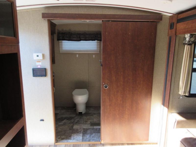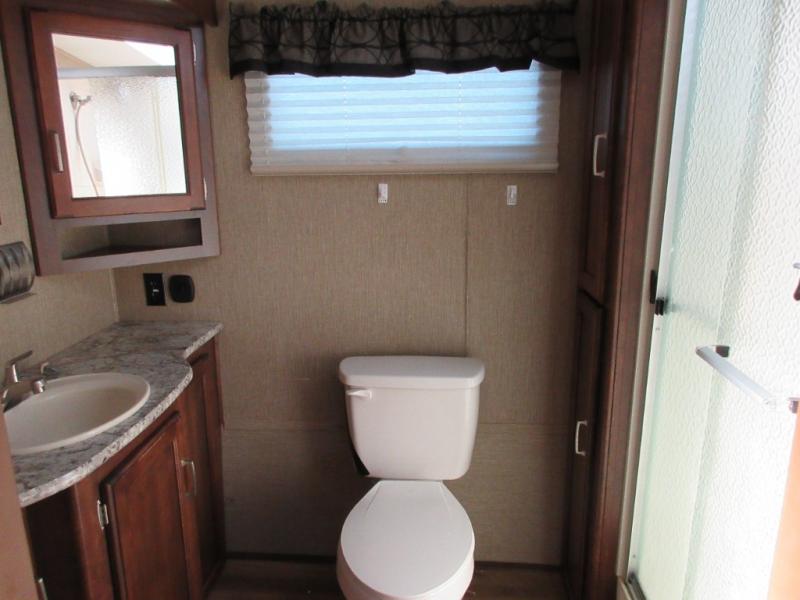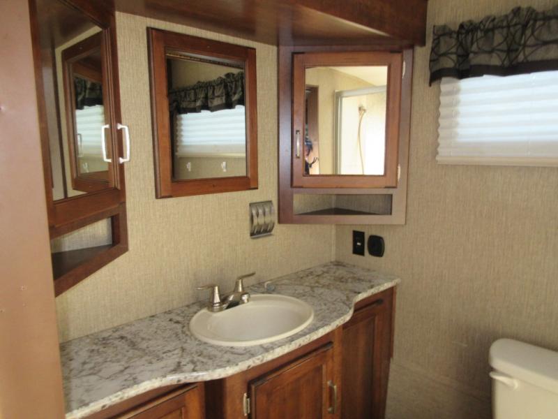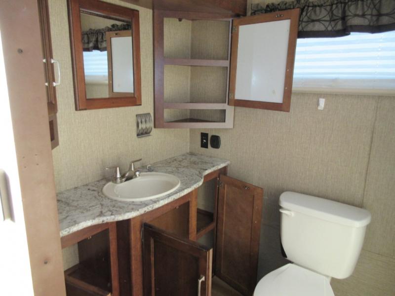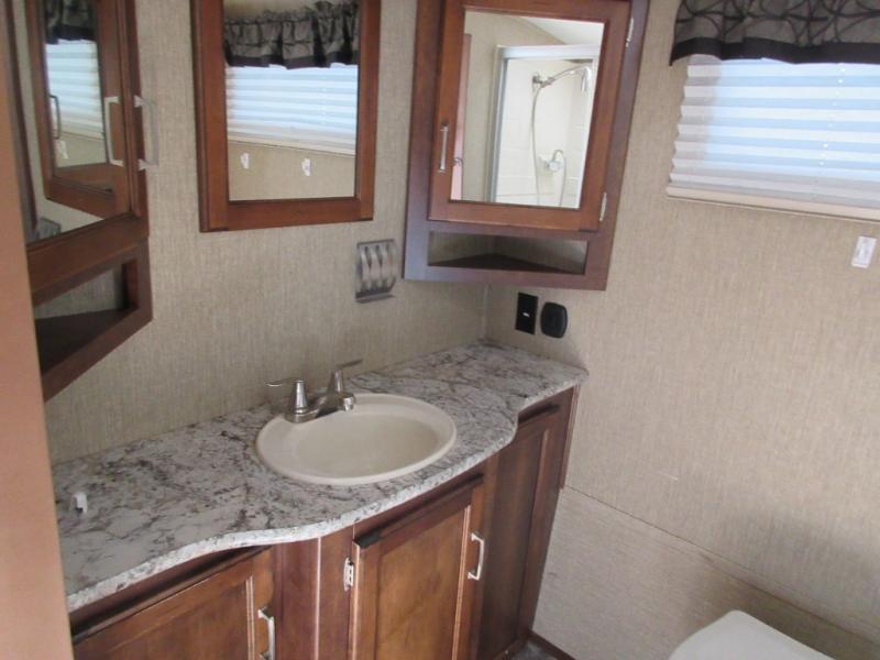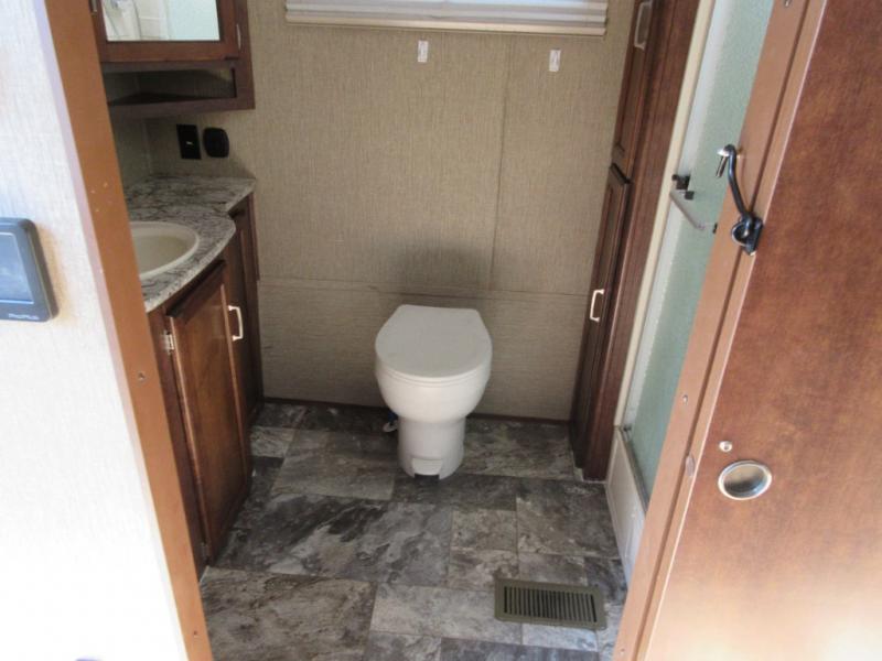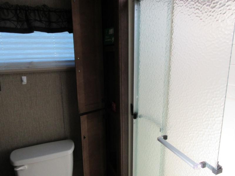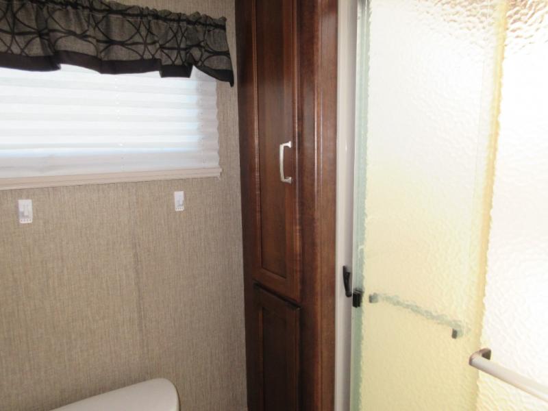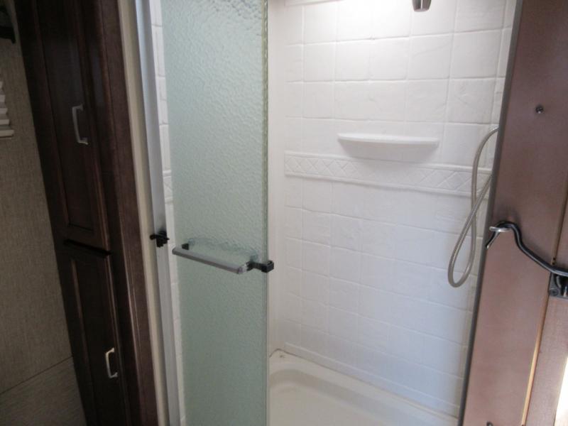 As you enter to your right there is a sliding door into the rear bathroom. Inside you will find a shower and linen cabinet along one side, a vanity with sink and overhead storage on the opposite side, and a toilet along the rear wall.