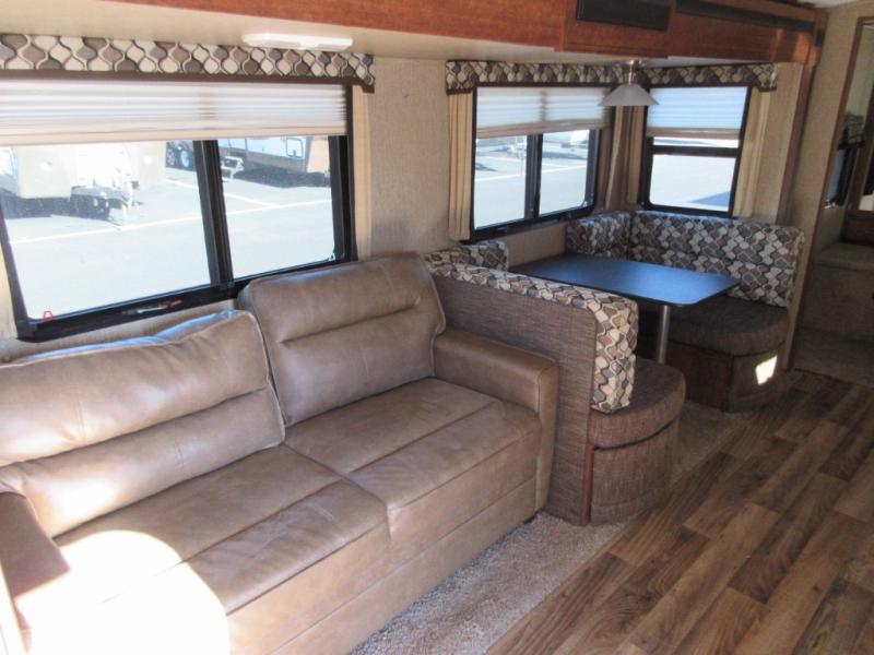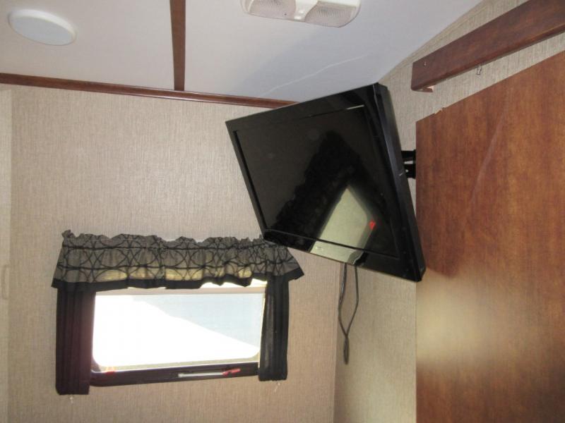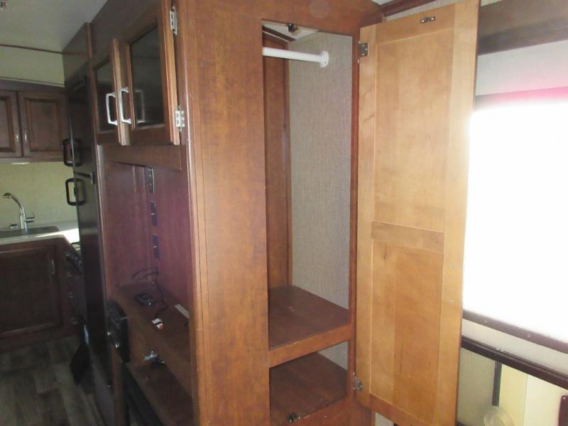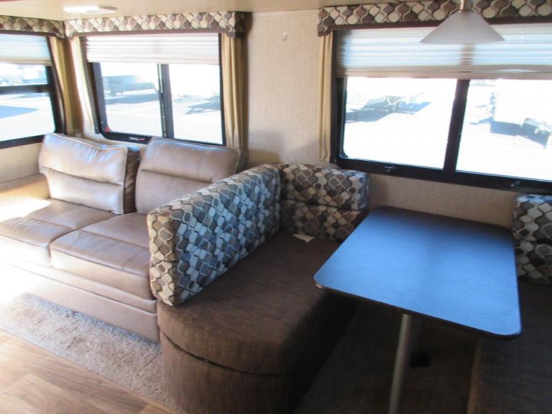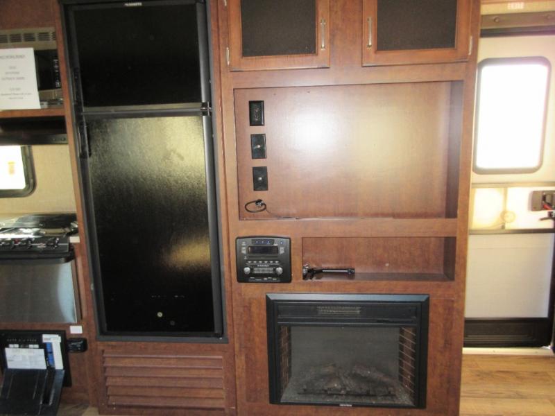 The main living and kitchen combined area includes a single slide out sofa sleeper and booth dinette providing more floor space, seating, and extra sleeping space when needed. On the opposite side you can enjoy the entertainment center with optional fireplace below, and entry closet. Next you will find a refrigerator, three burner range, corner countertop space, and a large kitchen sink. There are overhead cabinets for your dishes and things as well.