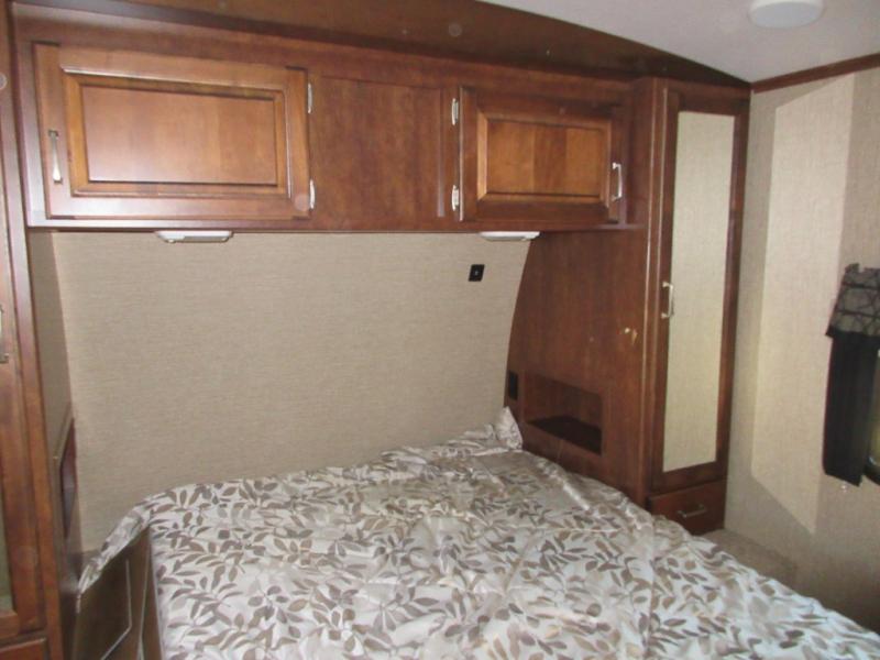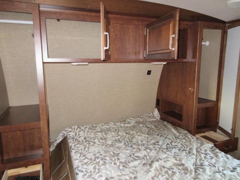 The front bedroom includes a space savings sliding door. Once inside you can rest on a queen size bed, store your camp clothes in the dual wardrobes, and place more items in the overhead storage above the bed.