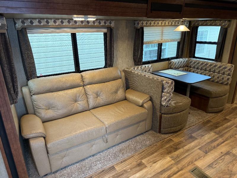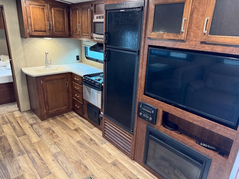 The main living and kitchen combined area includes a single slide out sofa sleeper and booth dinette providing more floor space, seating, and extra sleeping space when needed. On the opposite side you can enjoy the entertainment center with optional fireplace below, and entry closet. Next you will find a refrigerator, three burner range, corner countertop space, and a large kitchen sink. There are overhead cabinets for your dishes and things as well.