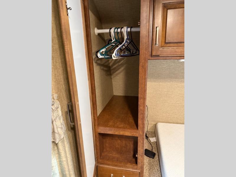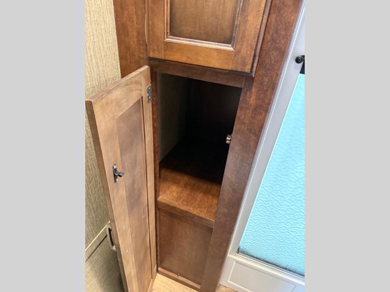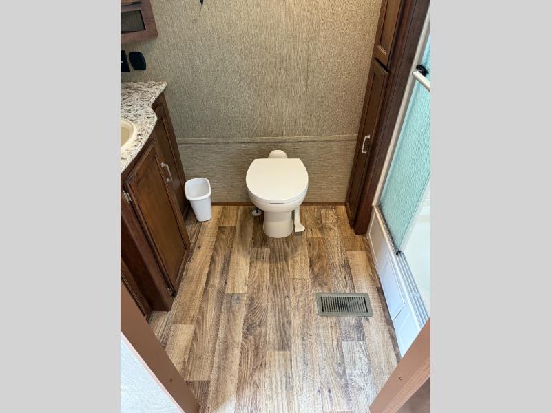 As you enter to your right there is a sliding door into the rear bathroom. Inside you will find a shower and linen cabinet along one side, a vanity with sink and overhead storage on the opposite side, and a toilet along the rear wall.