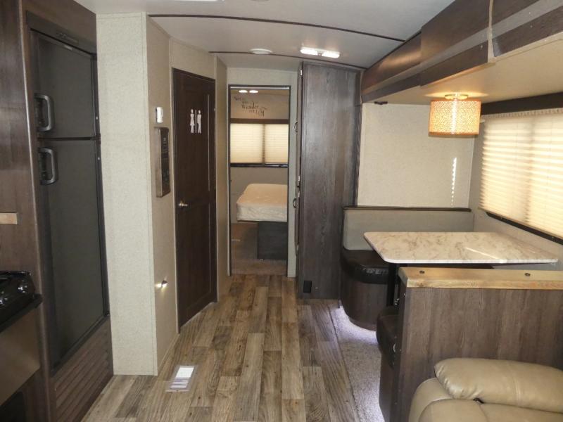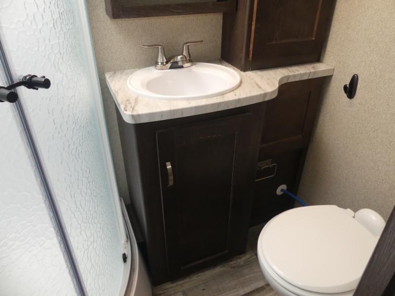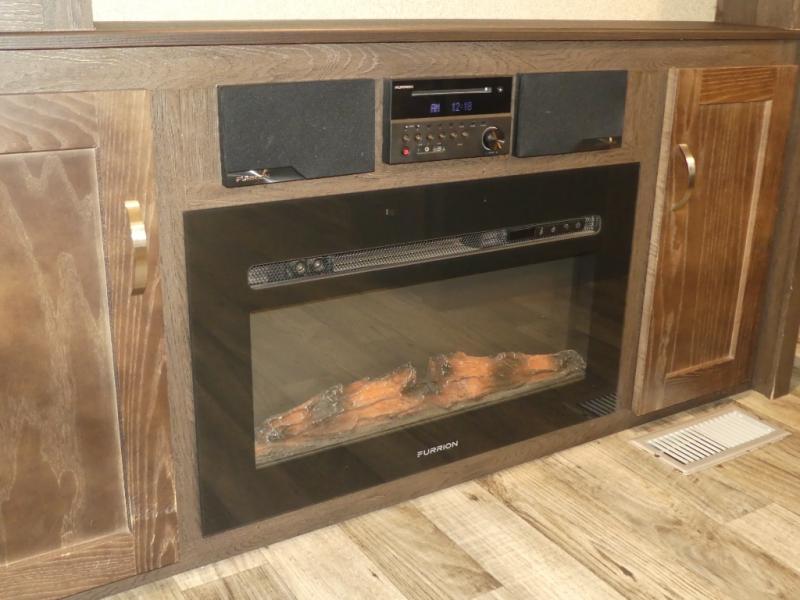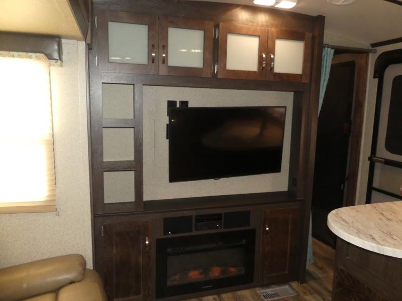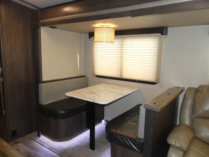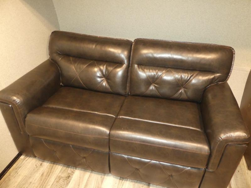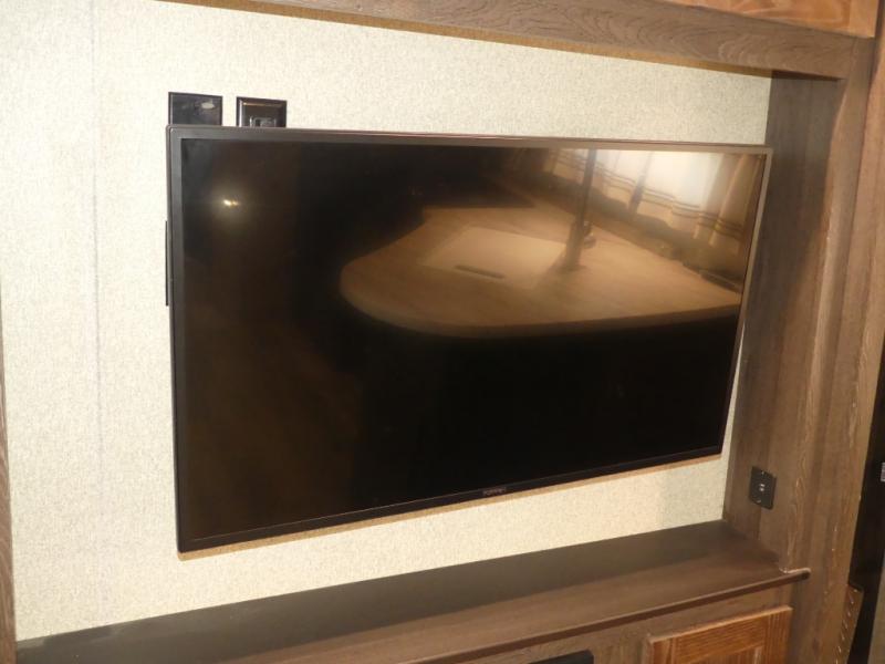Opposite the main side entry door find a slide out sofa sleeper and booth dinette. These offers ample seating during the daytime and when you are enjoying a meal. They can also both be simply made into additional sleeping space if needed at night. There is a nearby entertainment center adjacent to the sofa for viewing easily from anywhere in the room.