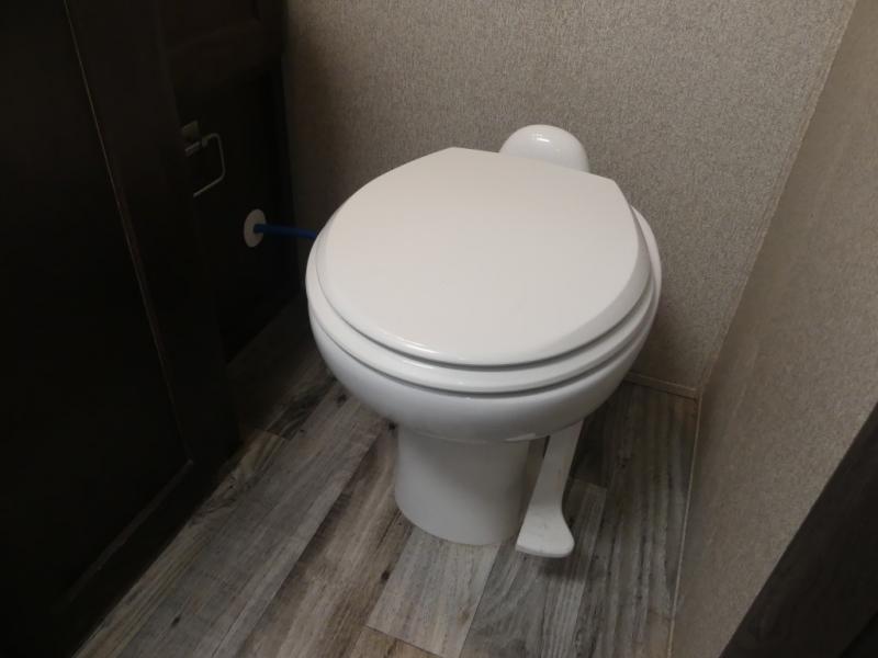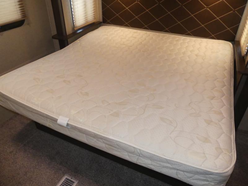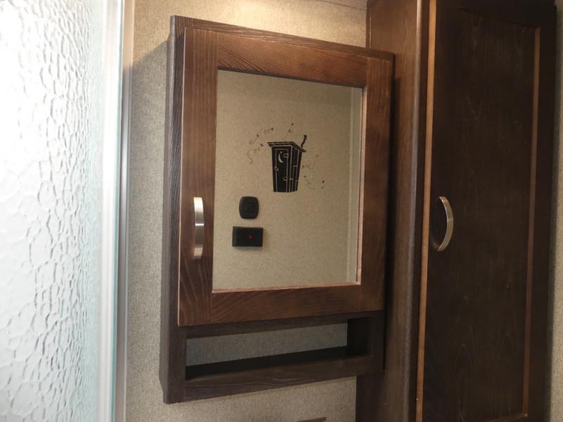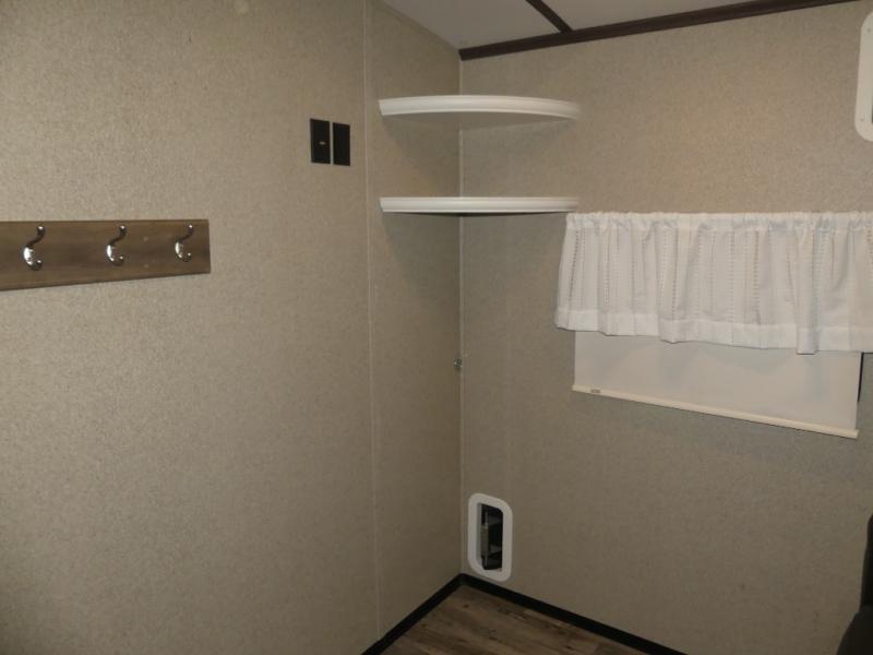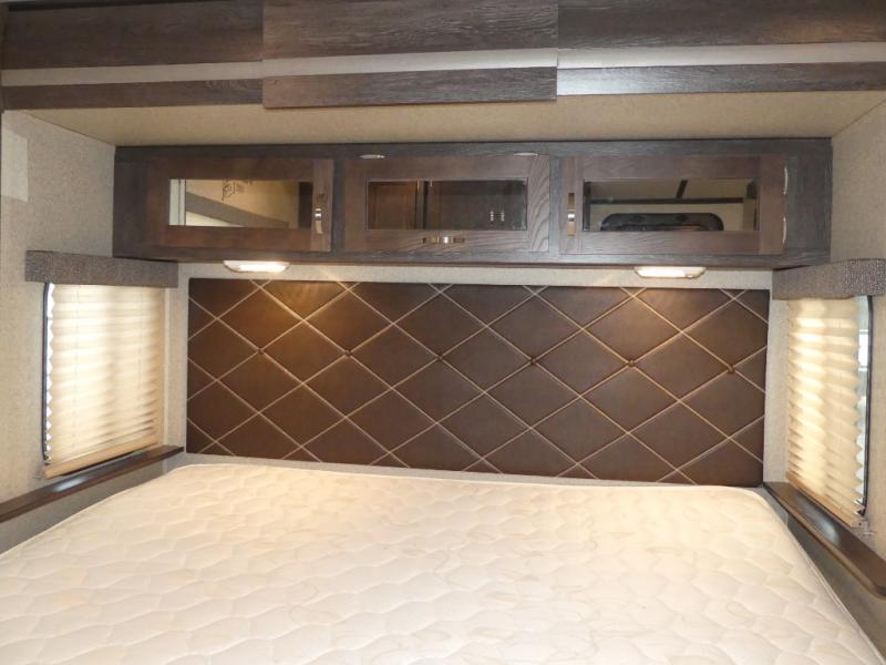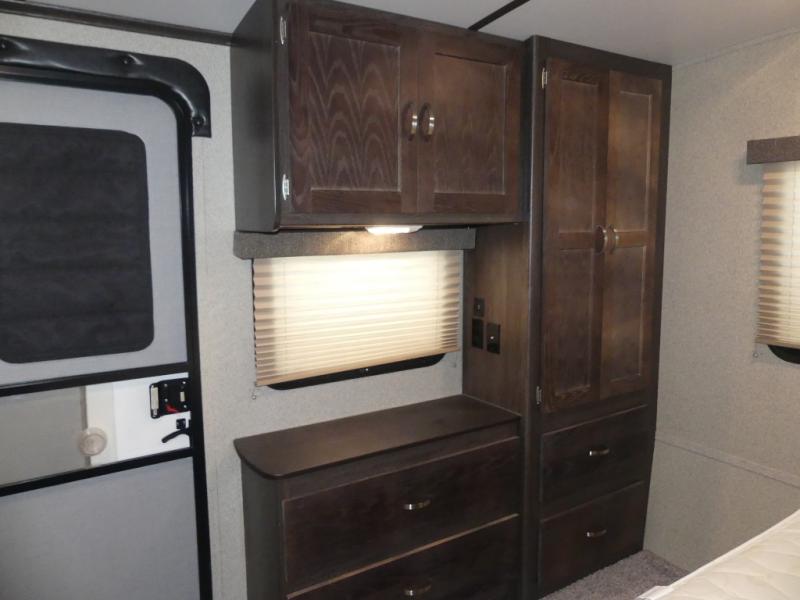 Enter the rear most side door and find yourself tucked away in the master bedroom with a king bed slide out with overhead cabinets. There is a wardrobe opposite the bed, and a dresser for more storage off the foot of the bed next to the exit door.