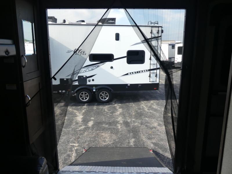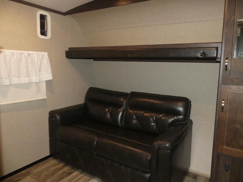 The very front of this Outback toy hauler features a cargo area with a corner wardrobe and set of 34" x 74" flip down bunk beds along the front of the trailer. A side 56" ramp door makes loading and unloading a breeze.