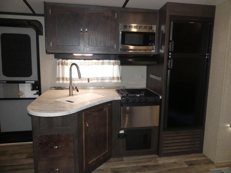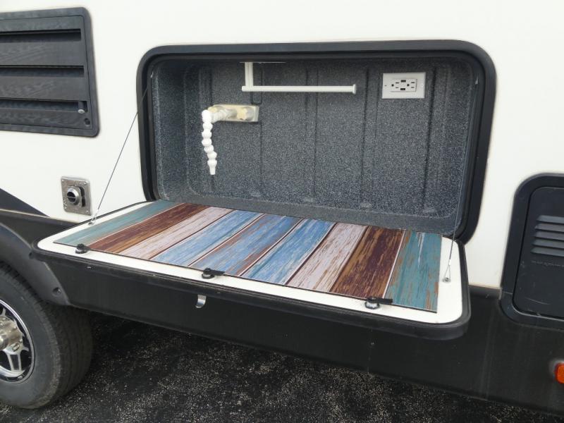 The chef in the family will love the outdoor camp kitchen which provides a single sink, two burner cook-top, and much more inside and out!