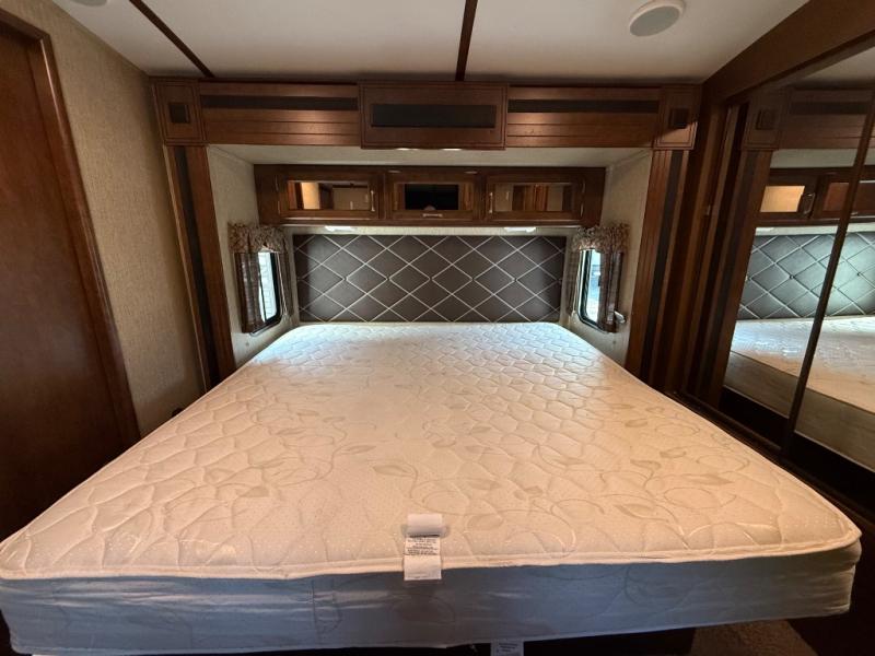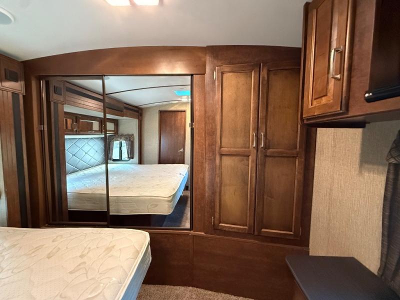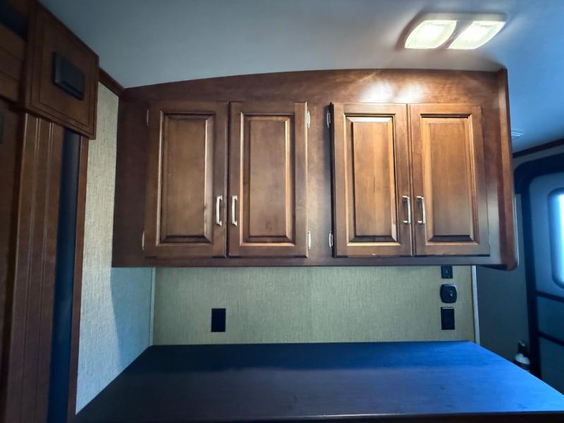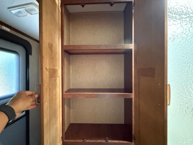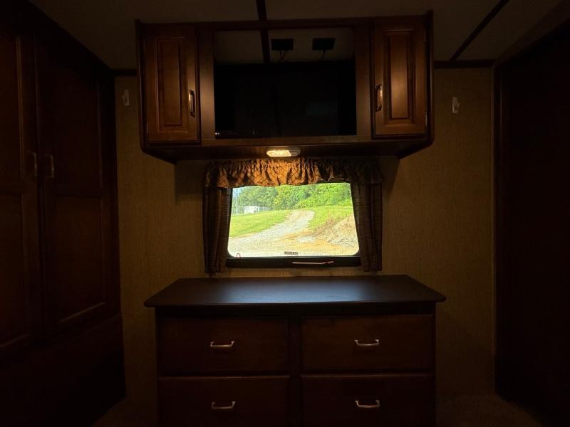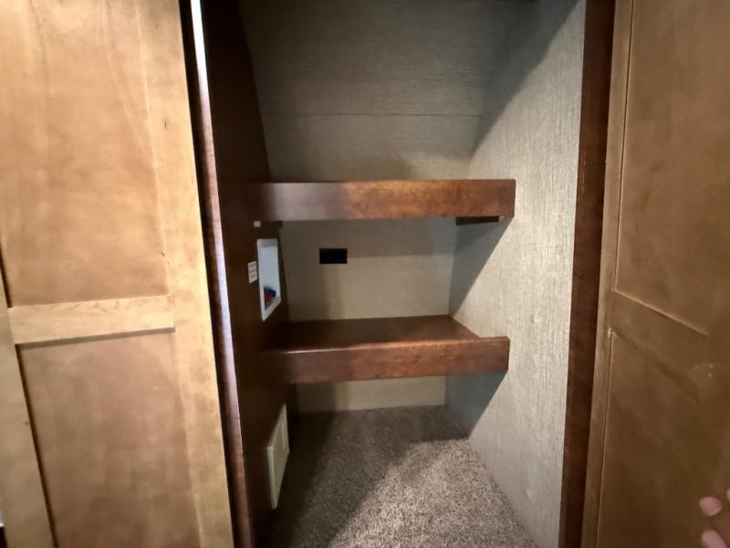In the front bedroom there is a slide out with a king bed and overhead cabinets. Across from the bed there is a dresser and overhead cabinets for more storage. Along the front wall you will find a large wardrobe, plus an area that has been washer/dryer prepped for your convenience. Now you won't have to bring home any dirty clothes!
