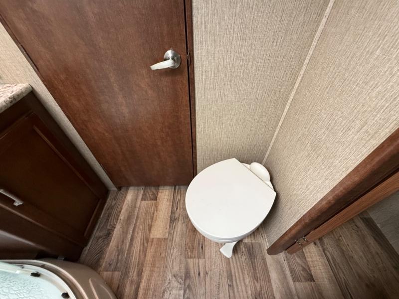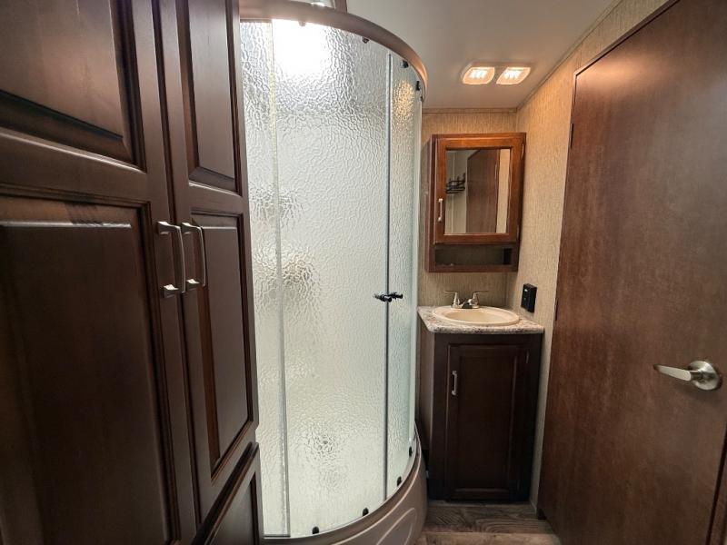 As you enter the trailer you will see the bathroom. Here you will find a linen cabinet, radius shower, sink, and a toilet. A second sliding door separates the bathroom from the master bedroom.