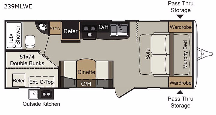 Have you been envisioning your family sitting around the campfire after riding bikes all day? Or daydreaming about visiting all the state parks with the comforts of home hitched up to your tow vehicle? This Passport 239MLWE Express travel trailer just makes sense when you need sleeping space for six to seven, appreciate having your own full bathroom, and love cooking outdoors. From the Murphy bed and sofa combination allowing for a bedroom up front or a living area to the rear set of double size bunk beds, you will be able to enjoy this model for years. Don't forget about the outside kitchen, and the exterior pass-through compartment. Family fun and loads of memories will happen when you travel with this Passport!