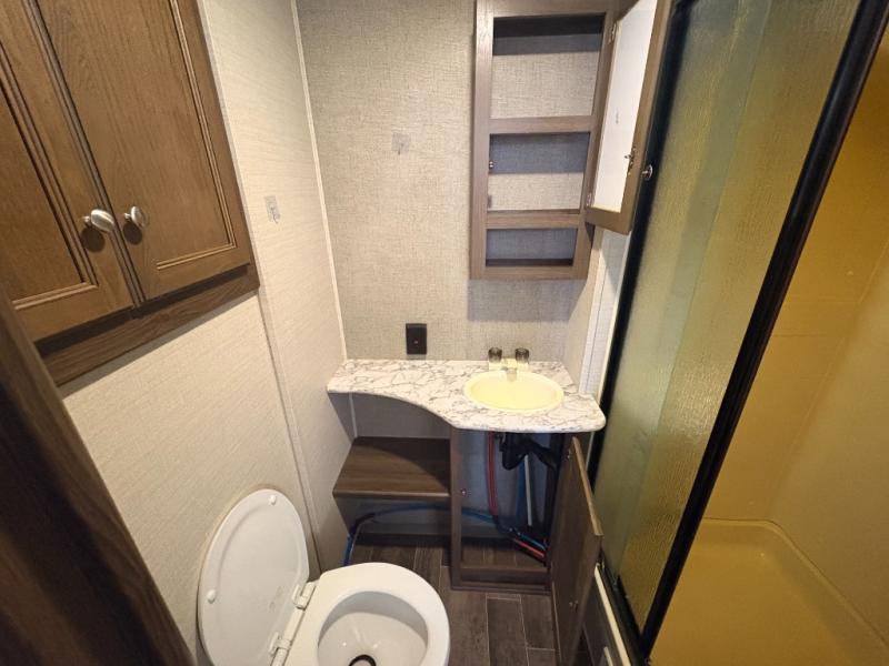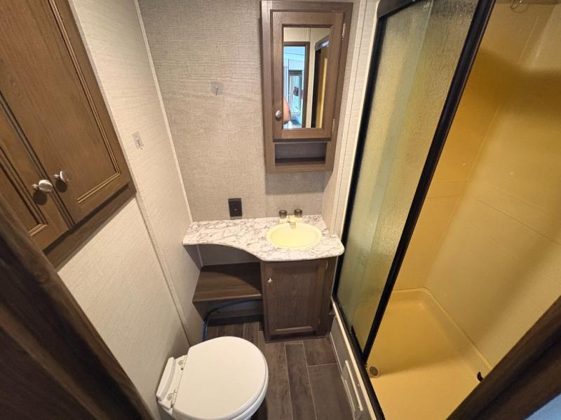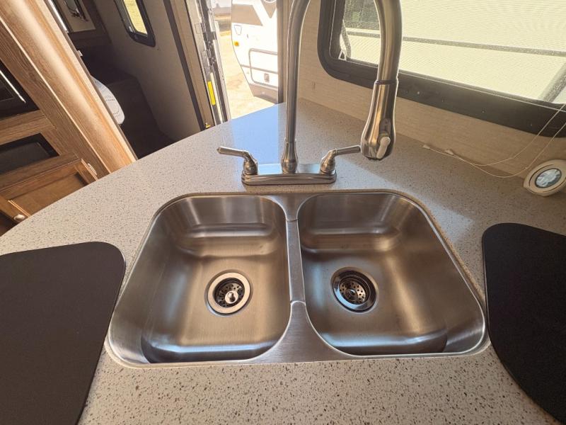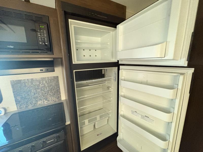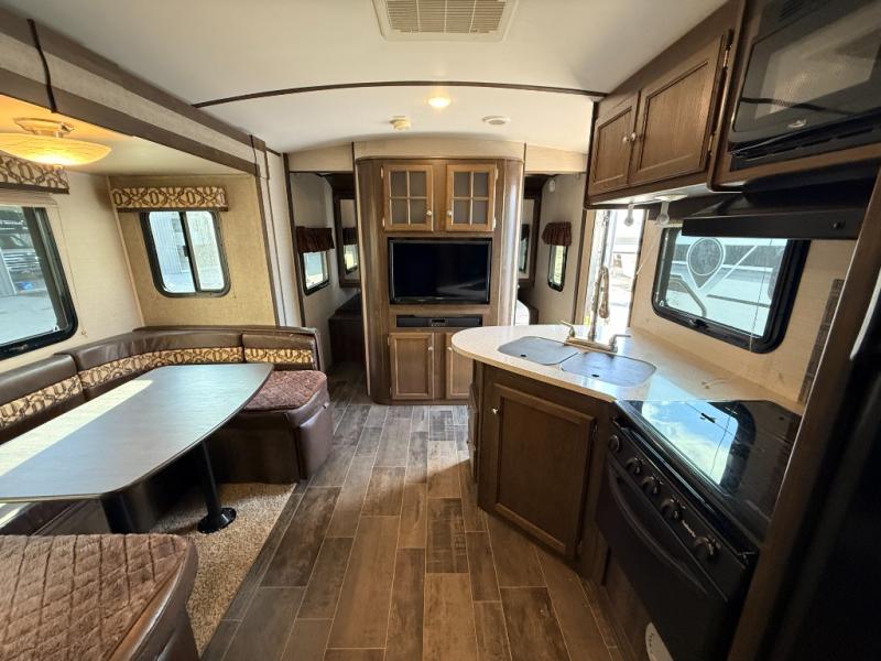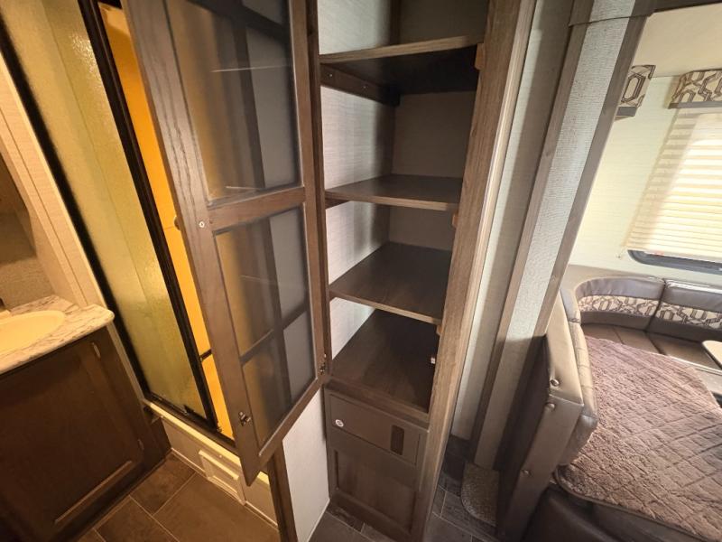 What truly sets this Premier Ultra Lite travel trailer apart from the rest of the competition is the max-depth slide room technology that it incorporates. Because of this constructive idea, the single slide that is included in this trailer provides you with the most utilized and available space that your slide room can give. The front private bedroom with a queen-size bed and the U-shaped booth dinette allow this trailer to sleep four people while you travel, and the rear bathroom gives everyone an extra bit of privacy as they get ready for the day ahead. One less cluttering item that you will have to worry about in this trailer is the laundry because with the addition of the laundry chute, your dirty garments can hide safely in the exterior pass-through storage that is located below the master bedroom.