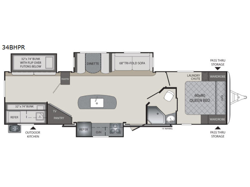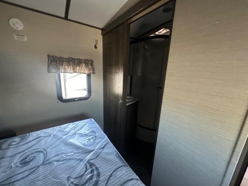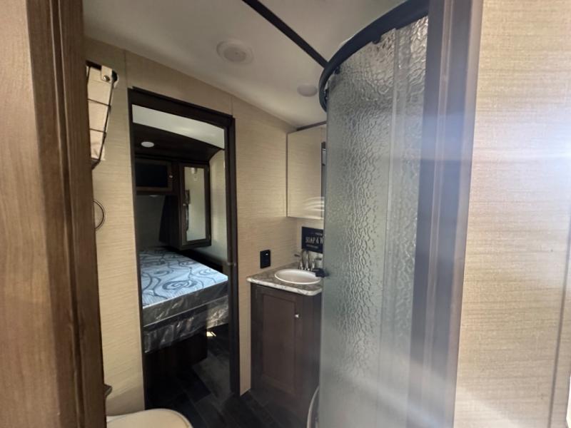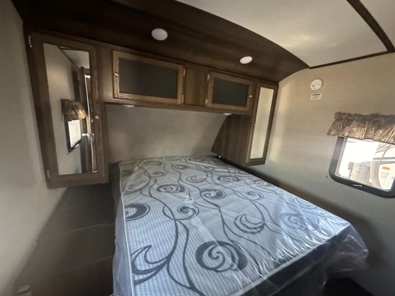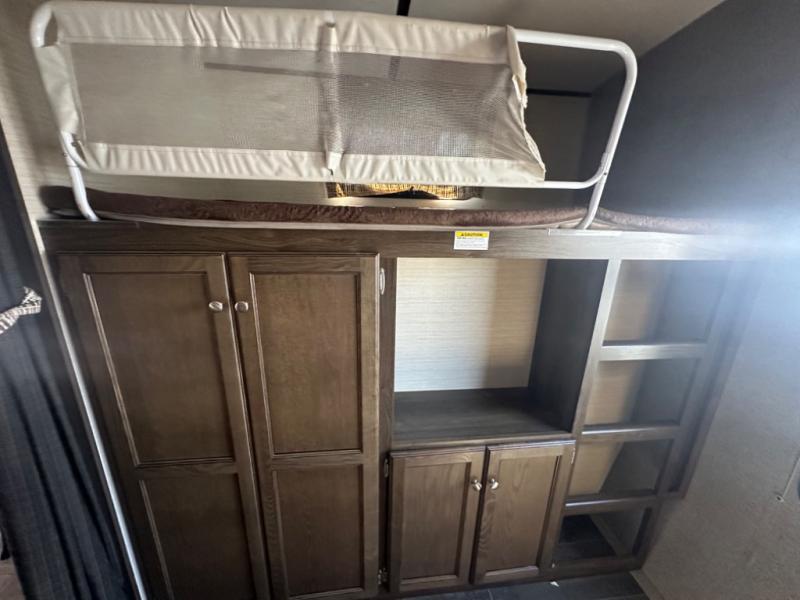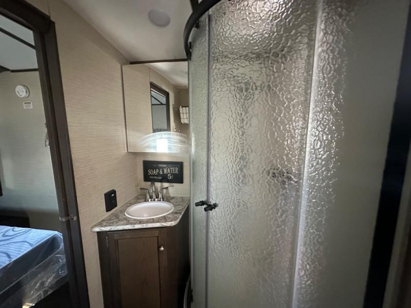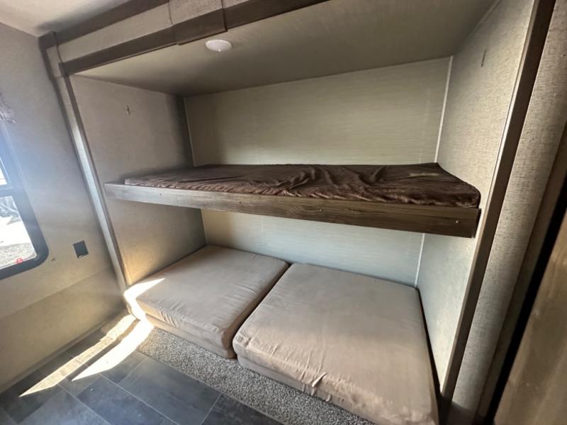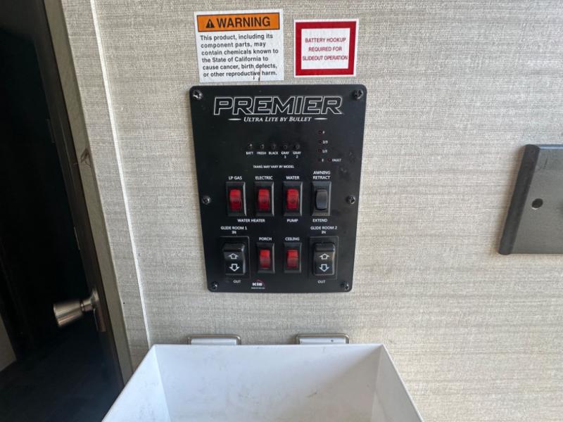 When you travel in this Premier Ultra Lite travel trailer, you will feel as if you are traveling in your very own home. With a private bedroom that has its own bathroom entrance and a semi-private bunkhouse, this trailer gives you the space that you are accustomed to having. This trailer can sleep nine people and store all of the luggage that comes along with those nine people because of the many closets and large exterior pass-through storage. And everyone will love gathering each night in the open-concept living area to watch a movie together on the 32" LED TV.