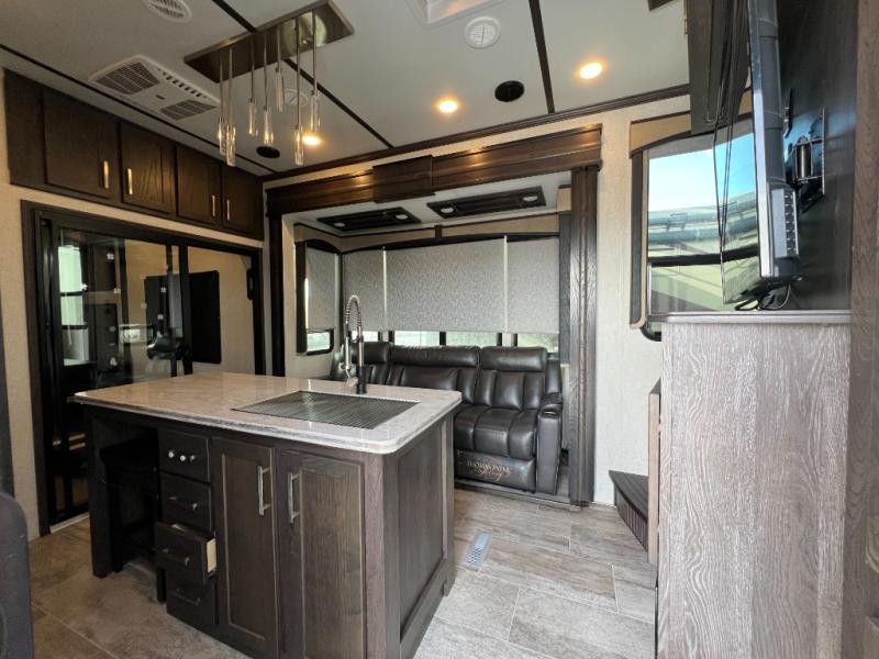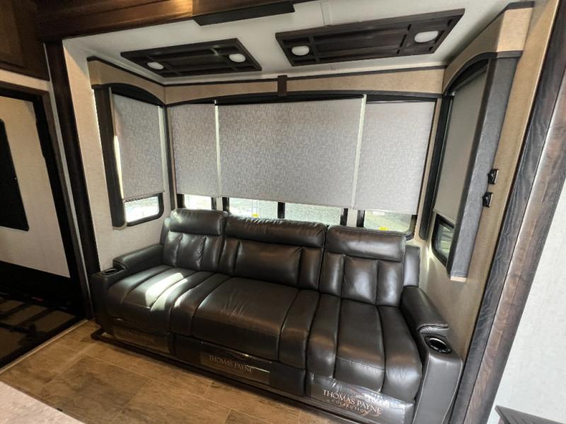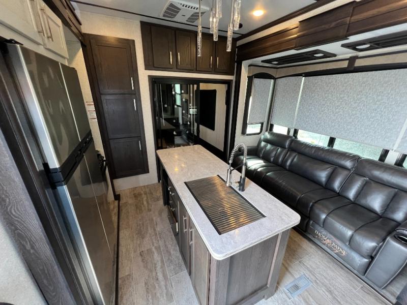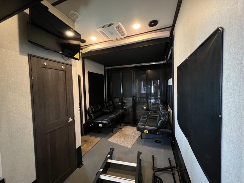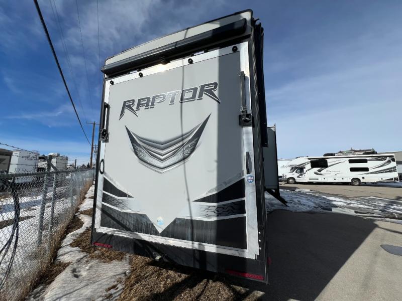 Taking a trip in this Raptor toy hauler gives you the sense that you are traveling in a palace on wheels. Every inch of this model has been beautifully customized and redesigned to make every experience a luxury. Whether you are lounging in the reclining furniture with heat and massage capabilities or baking a cake in the kitchen on top of the LED-infused countertops, this unit will wow you at every turn. The king-size suite provides a private entrance into the full bathroom, and the 13' separate garage houses the other half bathroom. After an evening of movies on the 50" LED HDTV, you will enjoy getting some fresh air outside underneath the 12' and 16' electric awnings with LED lights.