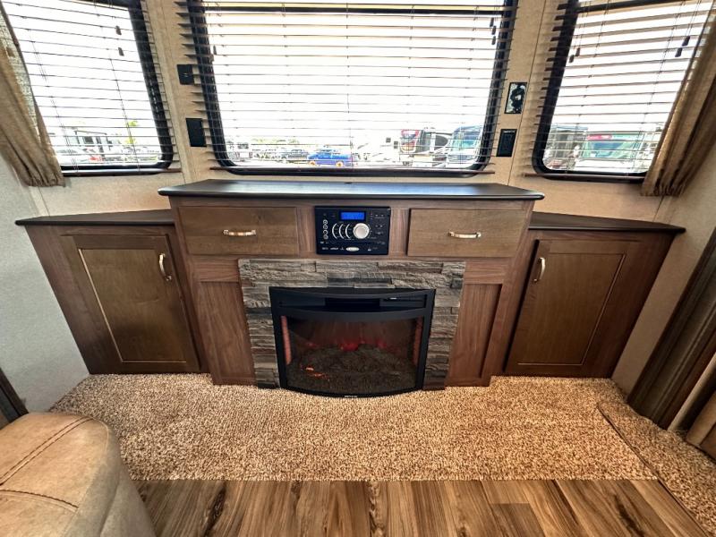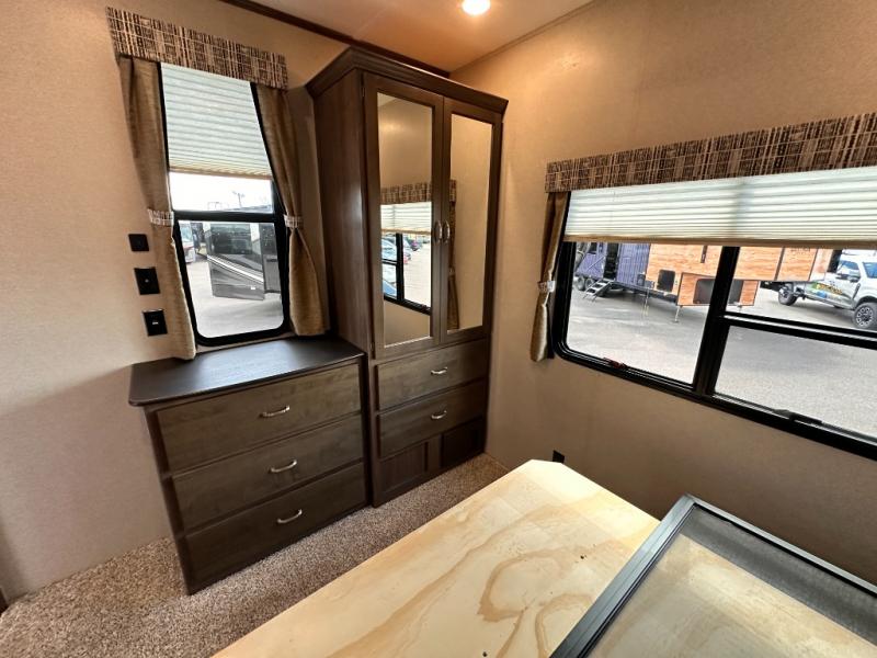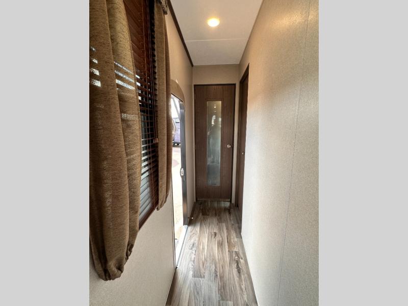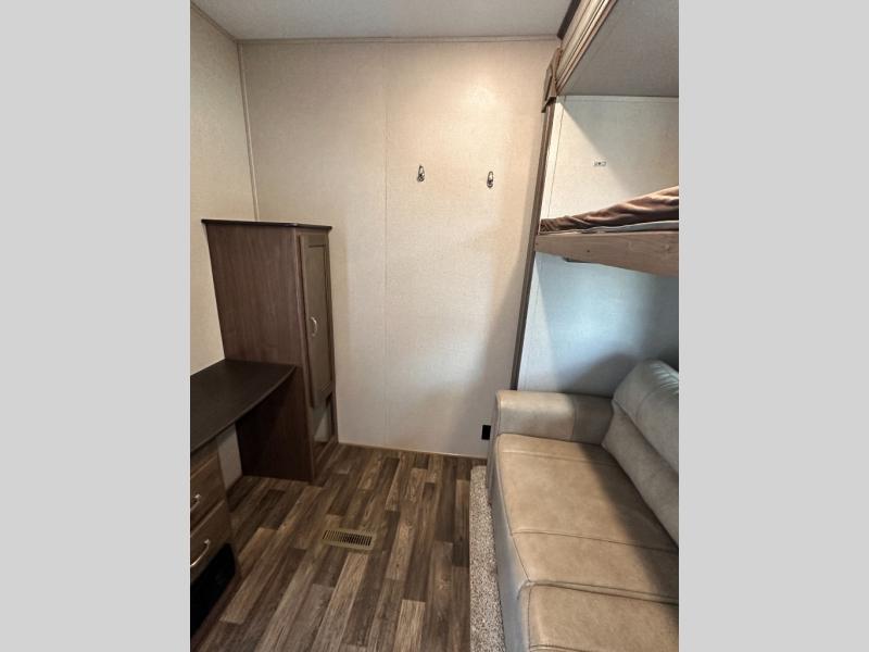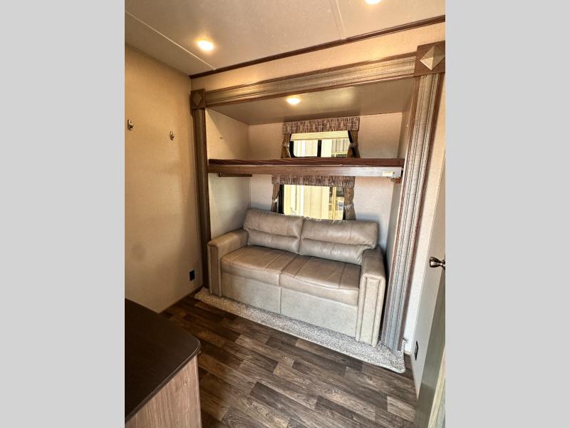If you are planning on staying for an extended period in any one place, then I would suggest you take a look at this Keystone Retreat model. You have an entertainment center in the front with a few different seating areas, so your guests are sure to have a place to relax when they come to visit. There is even a place for them to sleep if they want to spend the night. There is a second bedroom with a sofa sleeper and a fold down bunk. They even have a place for storing their things. You as the owners will have your own private bedroom in the rear; here you have a queen bed for a good night's rest and a place for your things. There is even a private entry into the bathroom for convenience at night.