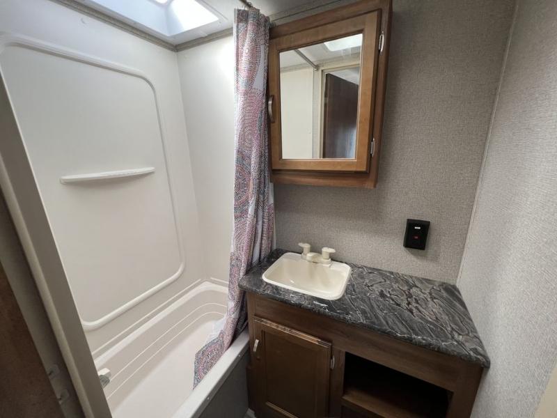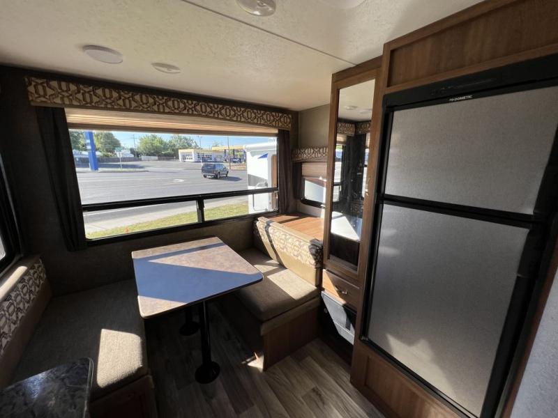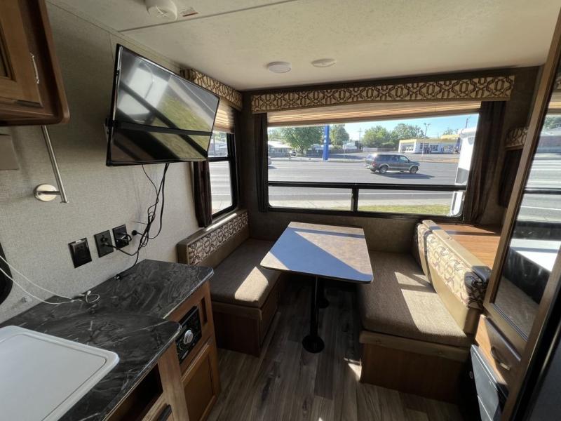 Enjoy camping in this Springdale 179QBWE by Keystone RV, it is the perfect "couple's coach." Outside you can put up the awning and enjoy a great day outside in the shade, just set up a few chairs and patio type furniture for some comfort. If you have some camp games, you can store them in the pass through storage and inside once the day of adventure or relaxing is done you can sleep comfortably in the queen sized bed. There is even a booth dinette in the rear that can fold down for a guest if needed.