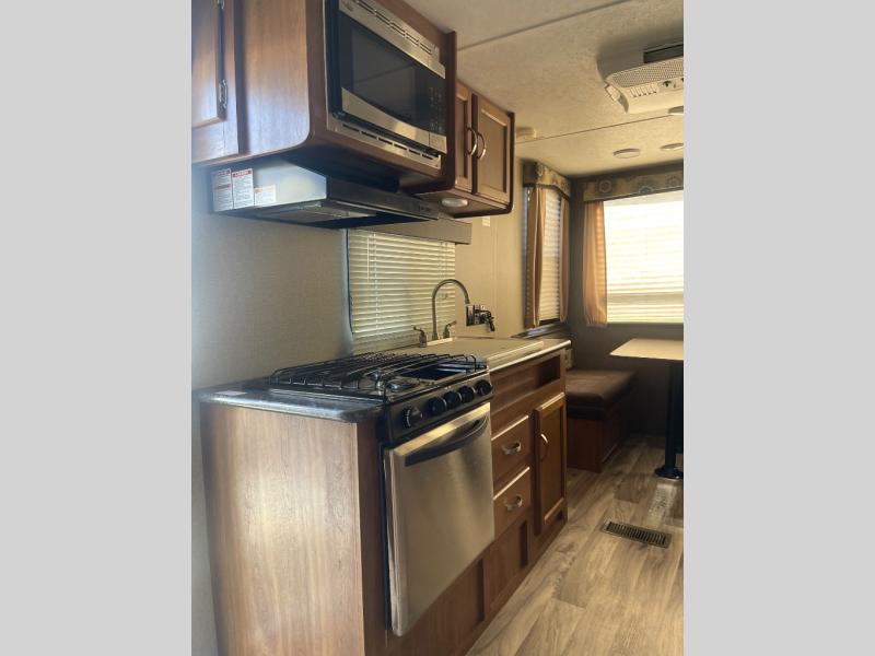 Enjoy camping in this Springdale 179QBWE by Keystone RV, it is the perfect "couple's coach." Outside you can put up the awning and enjoy a great day outside in the shade, just set up a few chairs and patio type furniture for some comfort. If you have some camp games, you can store them in the pass through storage and inside once the day of adventure or relaxing is done you can sleep comfortably in the queen sized bed. There is even a booth dinette in the rear that can fold down for a guest if needed.