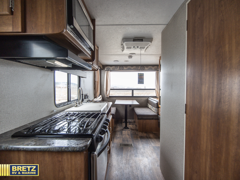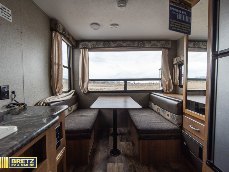 Enjoy camping in this Springdale 179QBWE by Keystone RV, it is the perfect "couple's coach." Outside you can put up the awning and enjoy a great day outside in the shade, just set up a few chairs and patio type furniture for some comfort. If you have some camp games, you can store them in the pass through storage and inside once the day of adventure or relaxing is done you can sleep comfortably in the queen sized bed. There is even a booth dinette in the rear that can fold down for a guest if needed.