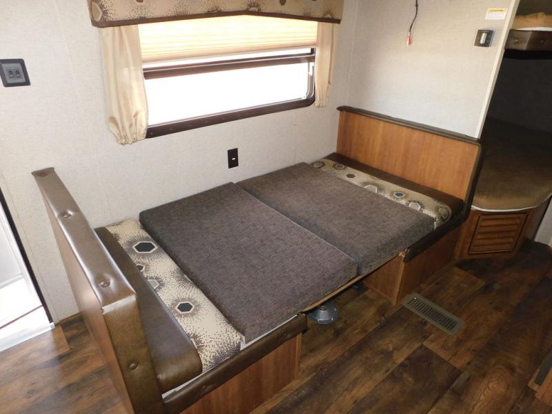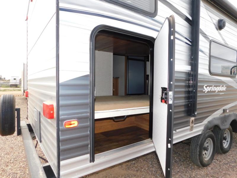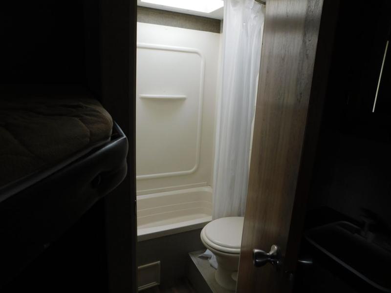 In the rear of this Springdale find a set of double size bed bunks with an angled inside corner on both. A nice bathroom is opposite and features a tub/shower, toilet, and separate sink just outside the bathroom door, plus so much more!